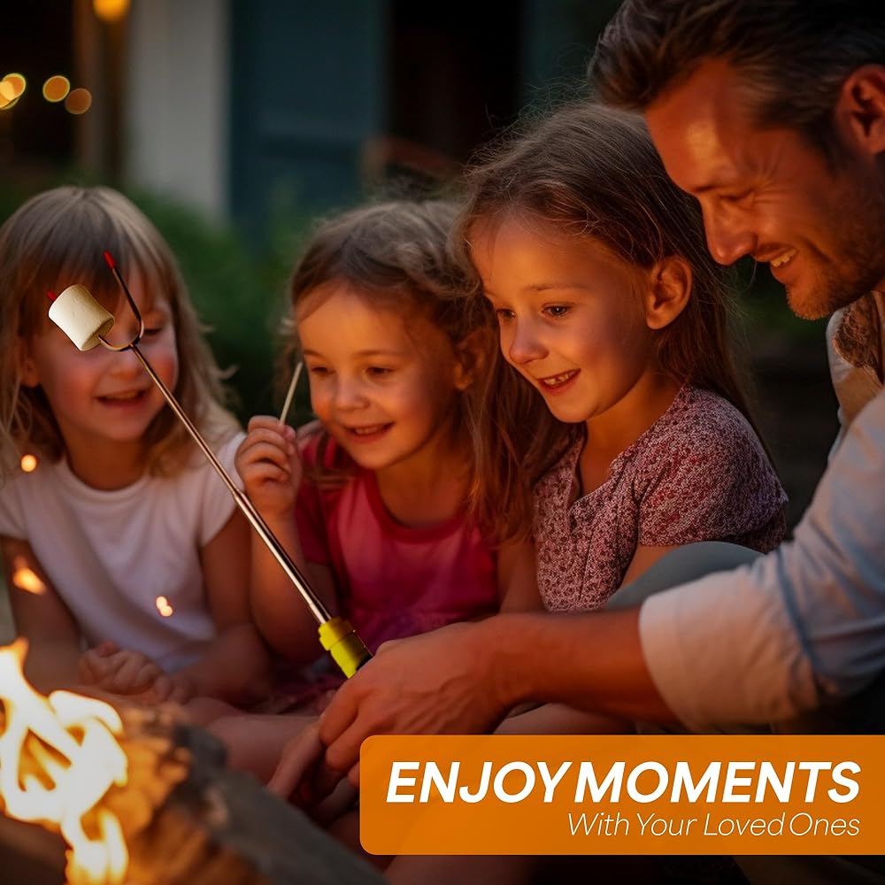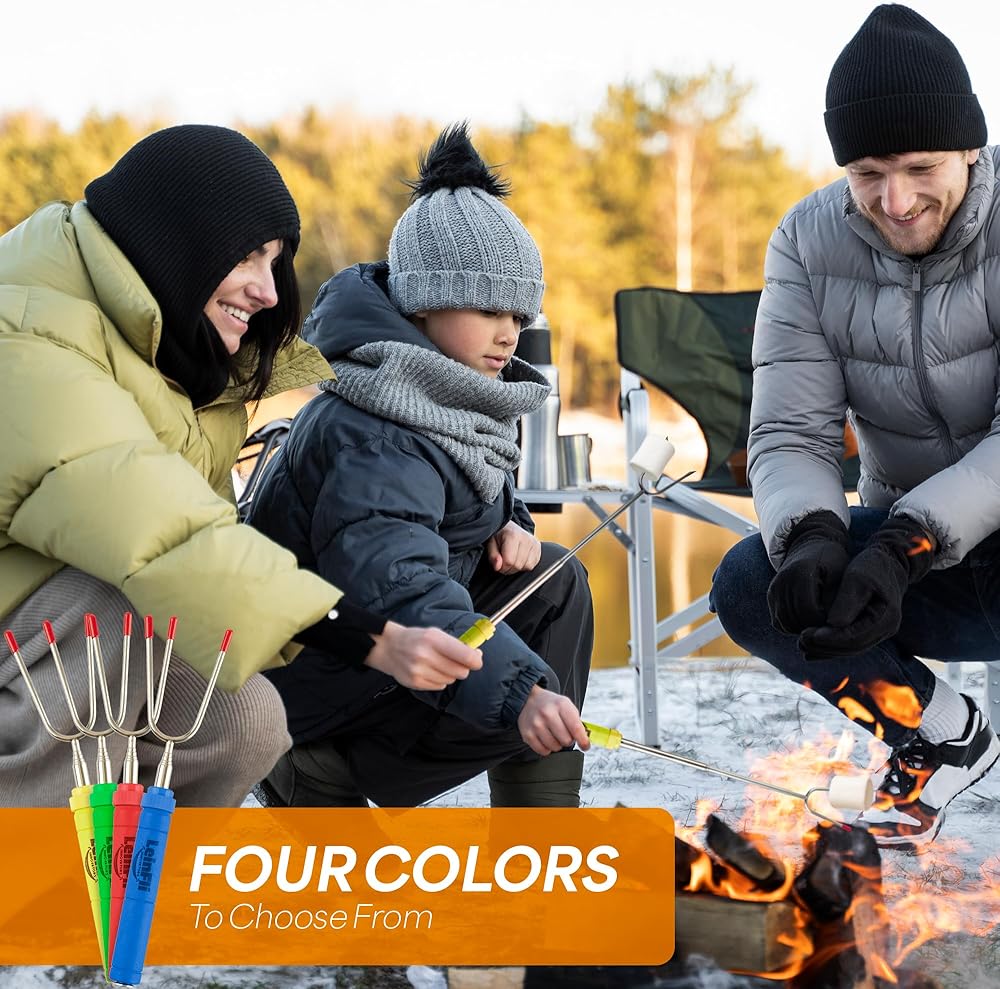 4 roasting sticks that allow you to roast marshmallows without the risk of injury, having adjustable length (like a radio antenna) from 10” retracted to 34” full extended. It is made of stainless steel and sturdy natural wood handles that will offer you a pleasant touch. It has a colourful plastic ring that allows you to rotate the sticks while roasting to have an even roast. Sticks have no color paint risking to tear off.