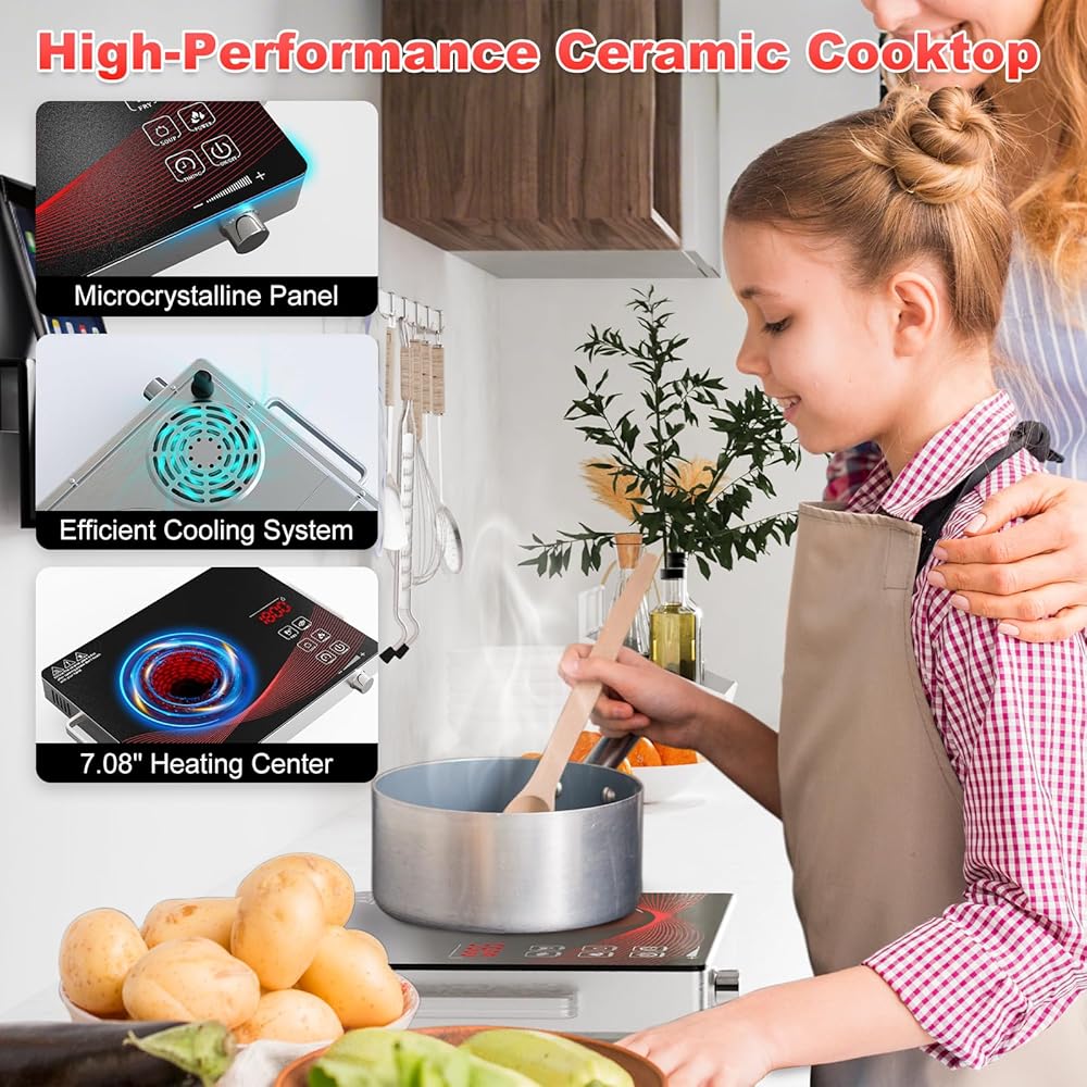 【سطح زجاجي أنيق وسهل التنظيف】 يتميز بموقد زجاجي أنيق ومتين ، لا يعزز هذا الموقد الكهربائي المحمول جماليات مطبخك فحسب ، بل يضمن أيضًا التنظيف دون عناء. تصميمه المدمج يجعله مثاليًا للشقق و RVs وغرف النوم والطبخ في الهواء الطلق.