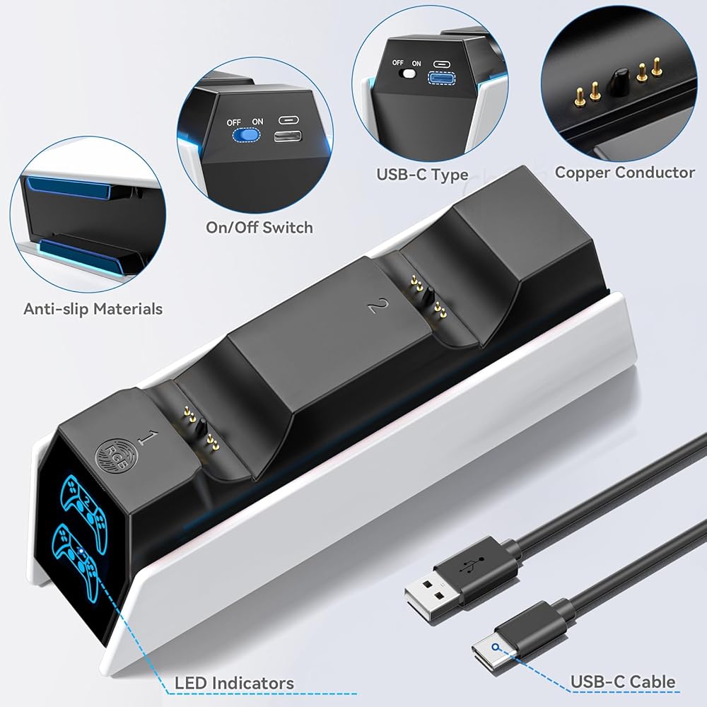 【شحن سريع لمدة ساعتين مع شريحة ذكية】 مزود بكابل شحن سريع 34.8 بوصة ، يمكن أن تستمد محطة شاحن PS5 هذه من الأمام أو الخلف من وحدة التحكم PS5 أو محول التيار المتردد الأصلي أو كمبيوتر محمول أو أجهزة أخرى. يمكن أن تتقاضى شحن اثنين من وحدات التحكم PS5 بالكامل في ساعتين فقط. بنيت في شريحة واقية ، يحمي هذا الشاحن البعيد PS5 وحدات تحكم PS5 وأجهزةك ضد التيار الزائد أو الزائد أو الدائرة القصيرة. تهمة الثقة ، حتى لو ترك الشحن بين عشية وضحاها