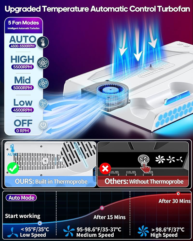 【سرعات المروحة الذكية التي تحكمها استشعار درجة الحرارة】 يأتي حامل PS5 مع سرعات تبريد قابلة للتعديل 3 مستويات ، والتي لديها القدرة الرائعة على التكيف بشكل مستقل مع ظروف درجات الحرارة المختلفة. تم تجهيزه مع مسبار درجة حرارة مدمجة. عندما تظل درجة الحرارة أقل من 95 درجة فهرنهايت/35 درجة مئوية ، تعمل المروحة في إعداد منخفض السرعة. إذا انخفضت درجة الحرارة في حدود 95 درجة فهرنهايت/35 درجة مئوية إلى 100 درجة فهرنهايت/38 درجة مئوية ، فإنها تتحول إلى سرعة متوسطة. وبمجرد أن تتجاوز درجة الحرارة 100 درجة فهرنهايت/38 درجة مئوية ، فإن المروحة AC