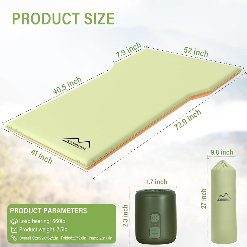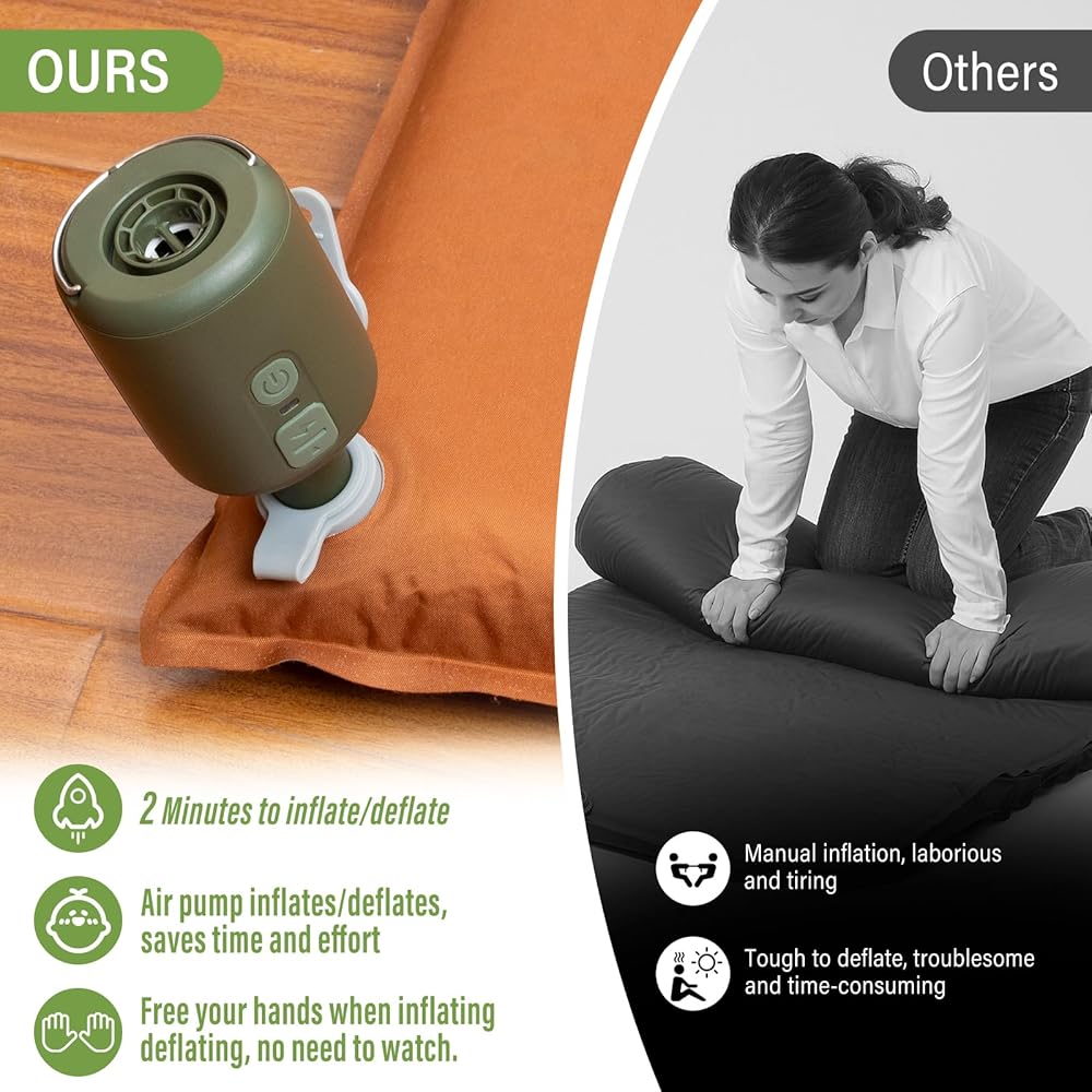 التضخم السريع والفعال: لا مزيد من الضخ اليدوي! تؤدي المضخة الكهربائية الخارجية إلى تضخيم منصة النوم بسرعة وسهولة. مع تدفق هواء 180 لتر/دقيقة و 4.5 كيلو باسكال ، يتضخم سرير مرتبة سيارات الدفع الرباعي إلى الحزم المثالي في دقائق فقط. الانكماش سهل بنفس القدر مع الصمام في اتجاه واحد لتقليل تسرب الهواء.