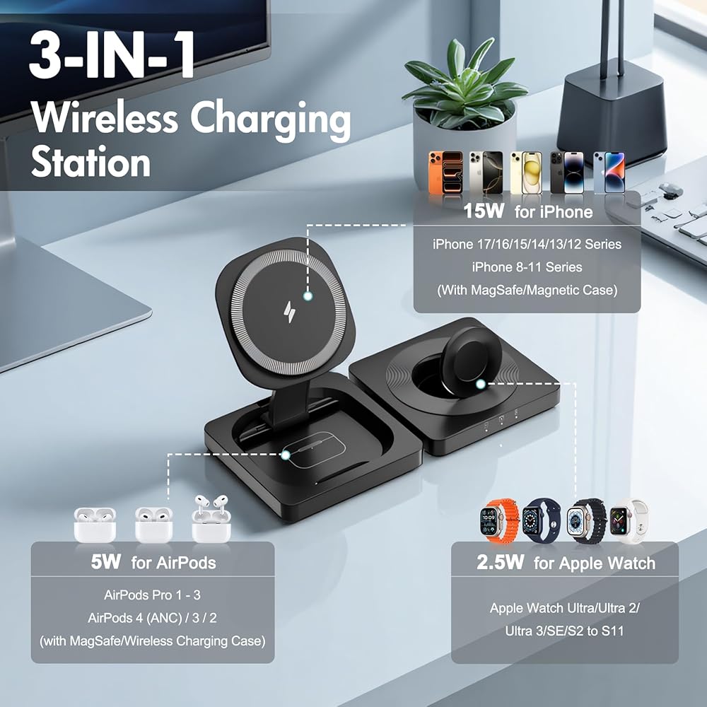 التوافق العالمي: هذا 3 في موقف الشحن اللاسلكي الآمن من MAG يتوافق مع أجهزة متعددة ، بما في ذلك iPhone 16E 16 15 14 13 11 8 Pro Max Mini Plus X XR XS Max Se Plus ، سلسلة Apple Watch 10 9 8 7 6 5 4 3 2 Se و Ultra ، AirPods 2 3 4 (للحصول على iPhone 8/X/11 و Airpods 2 4.