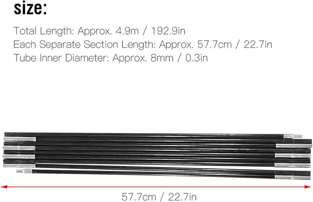 Multi sections foldable tent pole, includes 2 rods(4.9m length), each rod includes 9 segments(57.7cm length each segment).