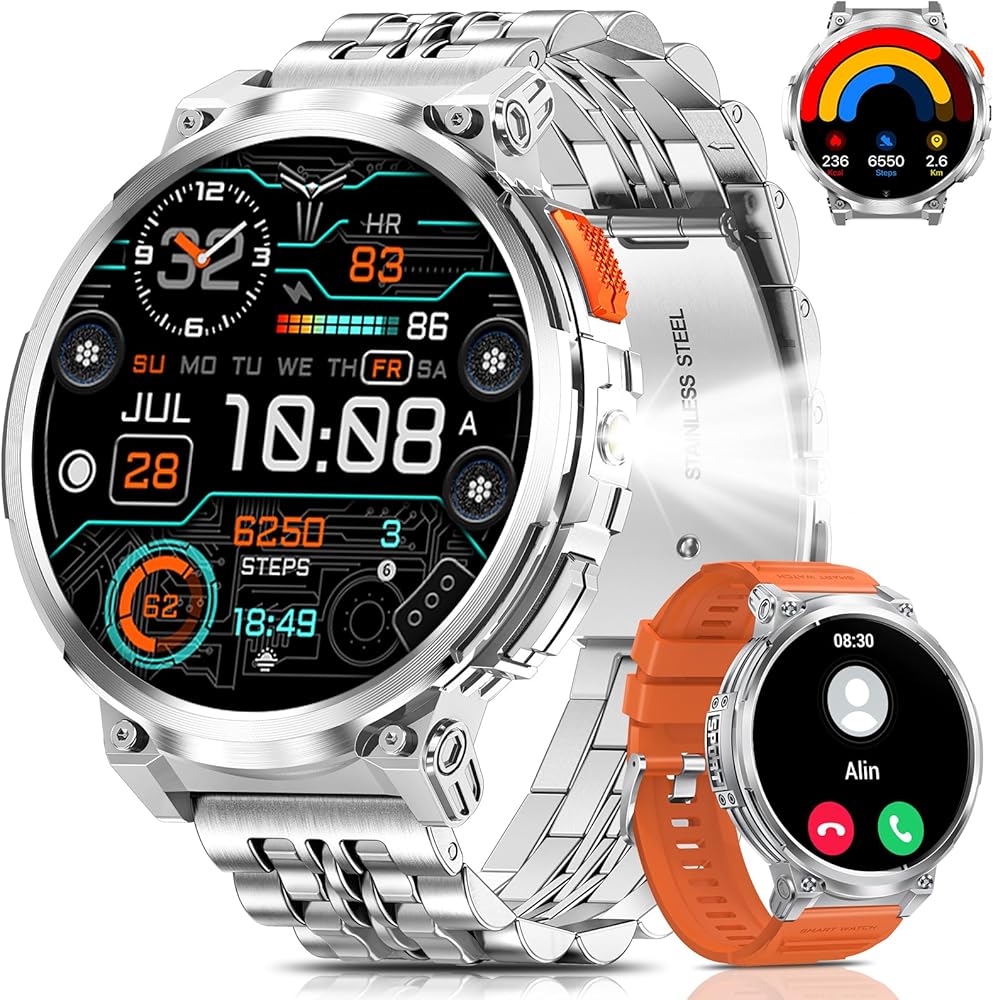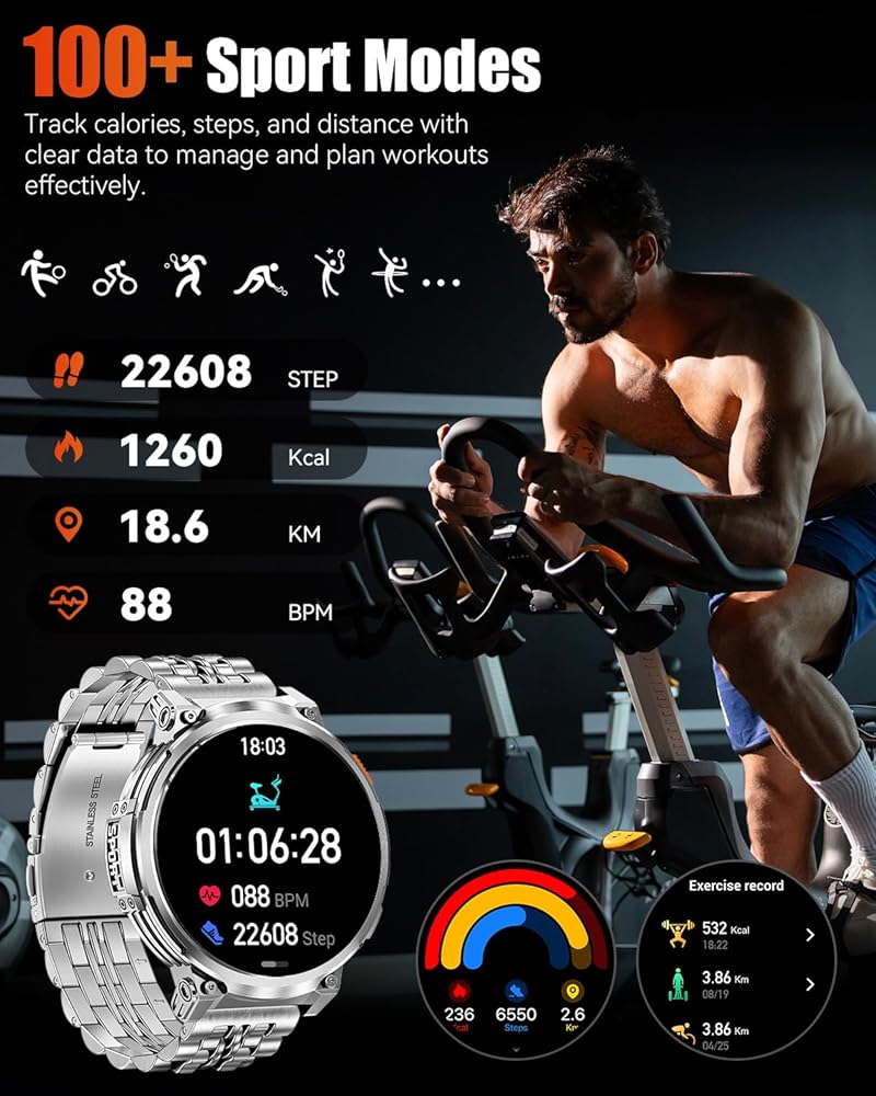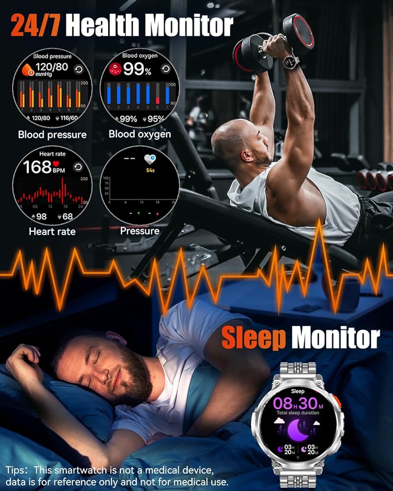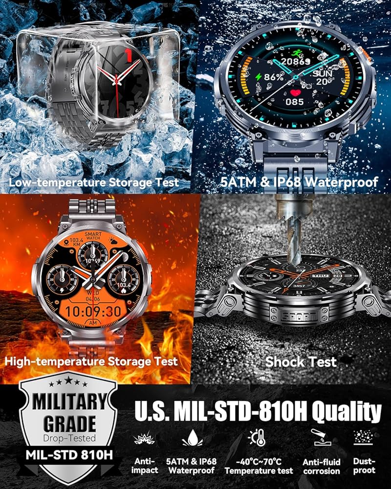 【المتانة العسكرية و IP68 مقاومة للماء】 تم تصميمها للبيئات الصعبة ، تتميز هذه الساعة الذكية بحالة مركبة ومعدنية من الدرجة العسكرية ، وتأثير النجاح ، ودرجة الحرارة ، والمزيد من الاختبارات. تقاوم الشاشة الزجاجية ذات القوة العالية الأضرار أثناء الأنشطة. مع IP68 عزل الماء ، فإنه مقاوم للماء والغبار والعرق ، وضمان أداء موثوق به في المطر أو غسل اليدين أو الأنشطة اليومية. يرجى ملاحظة أنه مناسب للتعرض اليومي للمياه مثل المطر أو غسل اليدين ، ولكن لا ينصح بالسباحة.