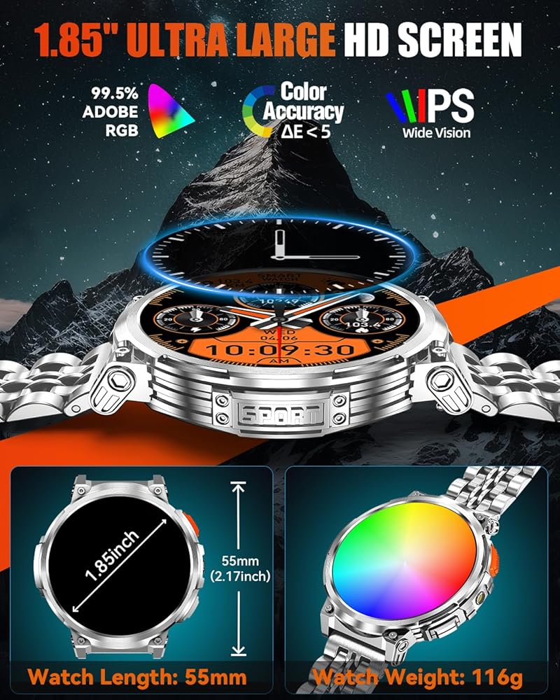 【تم ترقية شاشة كبيرة جدًا 1.85 بوصة】 استمتع وضوح مذهل مع شاشة HD IPS مقاس 1.85 بوصة ودقة 360*360. تضمن منطقة اللمس الموسعة سهولة التنقل في الإشعارات والتطبيقات. مع جسم معدني أنيق واتصل مستدير ، فإنه يوفر أسلوبًا وراحة للرجال ذوي المعصمين الأوسع. تزن 116 جرام مع حزام معدني وقطر 55 ملم ، هذه الساعة الذكية مثالية لأولئك الذين يفضلون نظرة أكبر.