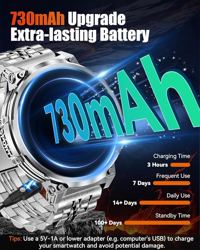 【بطارية 730mAh التي تدوم 730 مللي أمبير في الساعة】 مدعوم من بطارية كوبالت نقية بنسبة 100 ٪ في الساعة ، تتساقط هذه الساعة الذكية التكتيكية بالكامل في 3 ساعات فقط وتستمر 7-14 يومًا (اعتمادًا على الاستخدام) ، مع أكثر من 100 أيام من الاستعداد. تم تحسينه باستخدام تقنية توفير الطاقة الذكاء الاصطناعي ، ويضمن أقصى قدر من الكفاءة للأداء دون انقطاع على كل من التآكل اليومي والمغامرات الممتدة.