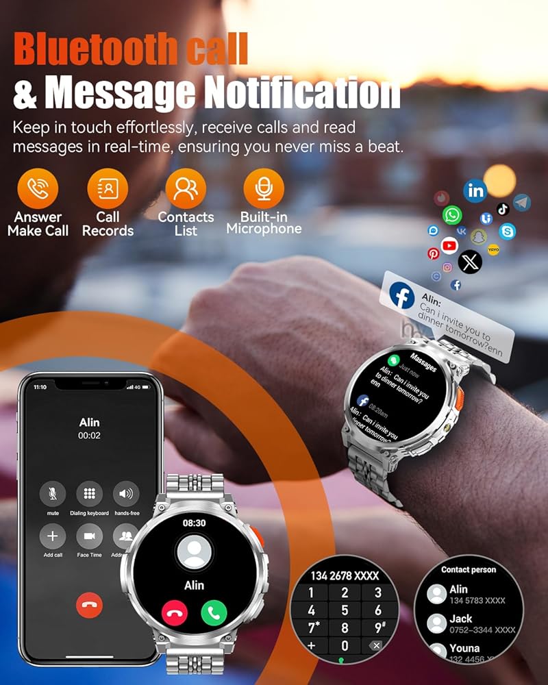 【استدعاء Bluetooth والإشعارات الذكية】 مع ميزة استدعاء Bluetooth المدمجة ، يمكنك إجراء واستقبال المكالمات مباشرة من الساعة دون الوصول إلى هاتفك. ابق على اتصال مع الإخطارات في الوقت الفعلي للرسائل والمكالمات والتطبيقات مثل WhatsApp و Facebook والمزيد. يرجى ملاحظة أن الساعة لا تدعم إرسال أو الرد على الرسائل النصية.