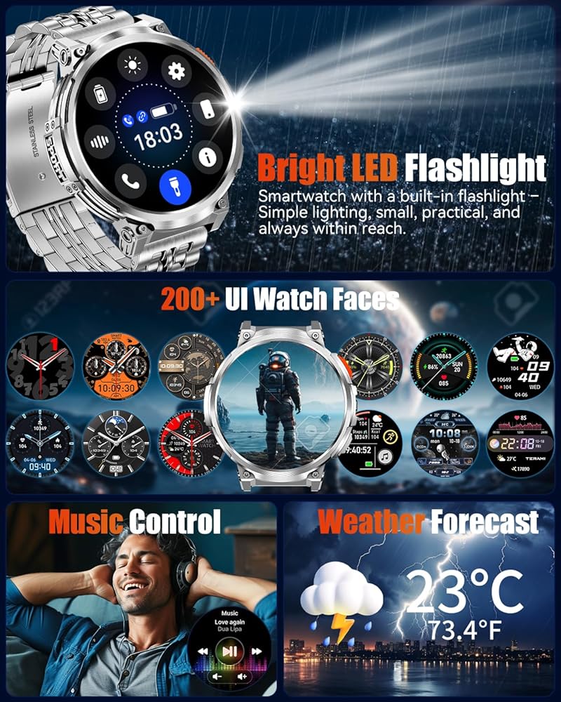 【مصباح يدوي مدمج ومتعدد الوظائف】 أكثر من مجرد ساعة ، يتميز هذا الجهاز بمصباح يدوي مدمج ، مثالي لبيئات الإضاءة المنخفضة مثل التخييم أو المساء. كما يوفر مساعد صوت AI ، المنبه ، توقعات الطقس ، التذكير المستقر ، والتحكم في الموسيقى ، مما يجعلها أداة متعددة الاستخدامات للاستخدام اليومي.