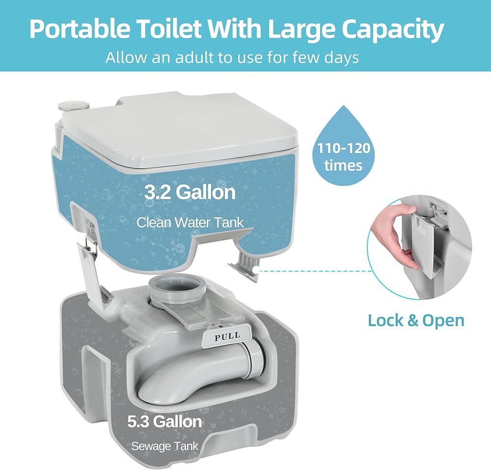 المرحاض المحمول الثقيل: مع قدرة قوية على الحمل تبلغ 275 رطلاً ، يقدم قعادةنا المحمولة دعمًا قويًا ، مما يضمن أن تتمكن من استخدامه بثقة في جميع رحلاتك الخارجية. الراحة وراحة البال ، أينما ذهبت