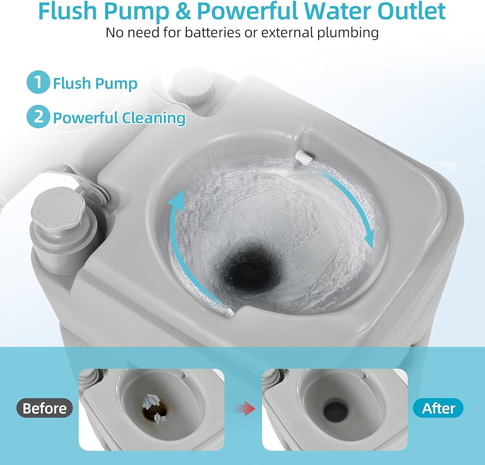 المرحاض المحمول ذو الكفاءة المزدوجة: يوفر مرحاضنا المحمول تدفقًا مزدوجًا بمضخة متكاملة ، مما يضمن تنظيفًا قويًا دون الحاجة إلى البطاريات أو السباكة. حل بسيط وفعال لأي موقف أثناء التنقل