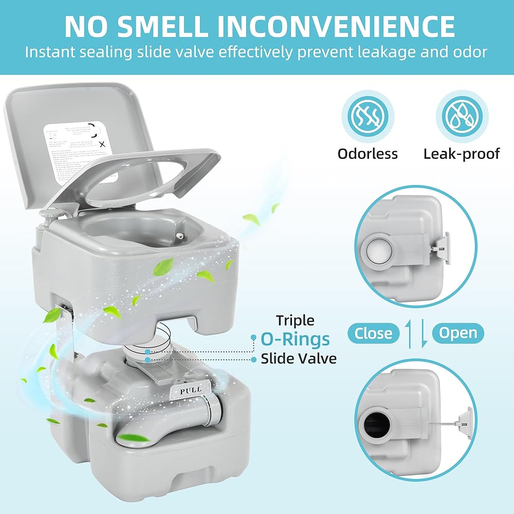 مرحاض محفوظ للرائحة: تم تصميمه مع صمام شريحة فوري ، وحمام التخييم الخاص بنا يمنع التسربات والروائح غير المرغوب فيها. يتيح لك SPOT الإفراغ بحجم سخاء صب النفايات بسهولة وبشكل كامل ، دون أي بقايا متبقية