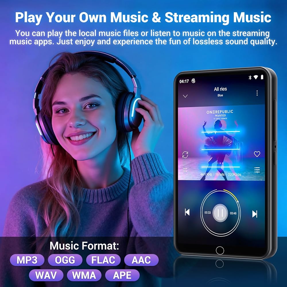 Experience music like never before with this versatile portable MP3 player featuring both Bluetooth and WiFi connectivity. Perfect for music enthusiasts on the go, this sleek device lets you stream your favorite tunes wirelessly or store them directly on the player. The wireless capabilities enable seamless connection to your Bluetooth headphones or speakers, while WiFi connectivity opens up a world of online music streaming possibilities. Whether you're commuting, working out, or simply relaxing, this MP3 player delivers crystal-clear audio quality and convenient playback controls. Its compact size makes it easily pocketable, while the intuitive interface ensures effortless navigation through your music library. Skip the hassle of carrying your smartphone for music and enjoy a dedicated device that focuses on what matters most - your listening experience. The perfect companion for music lovers who value both portability and connectivity options.