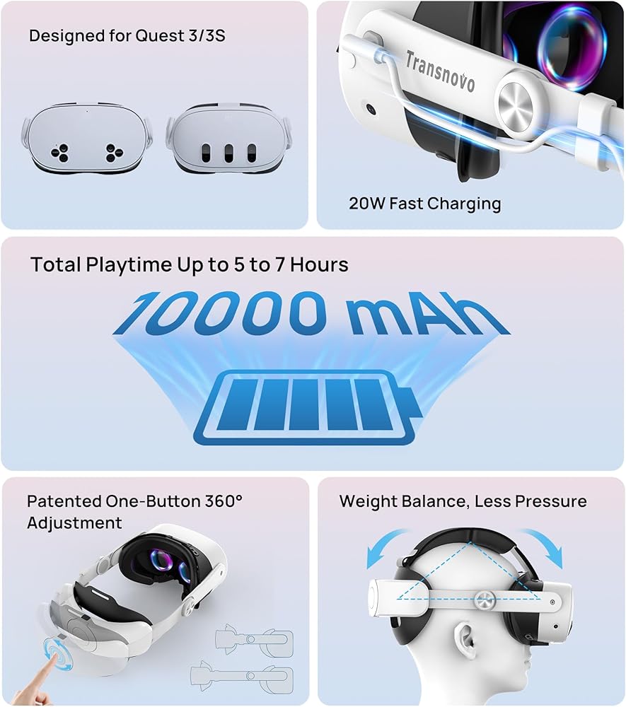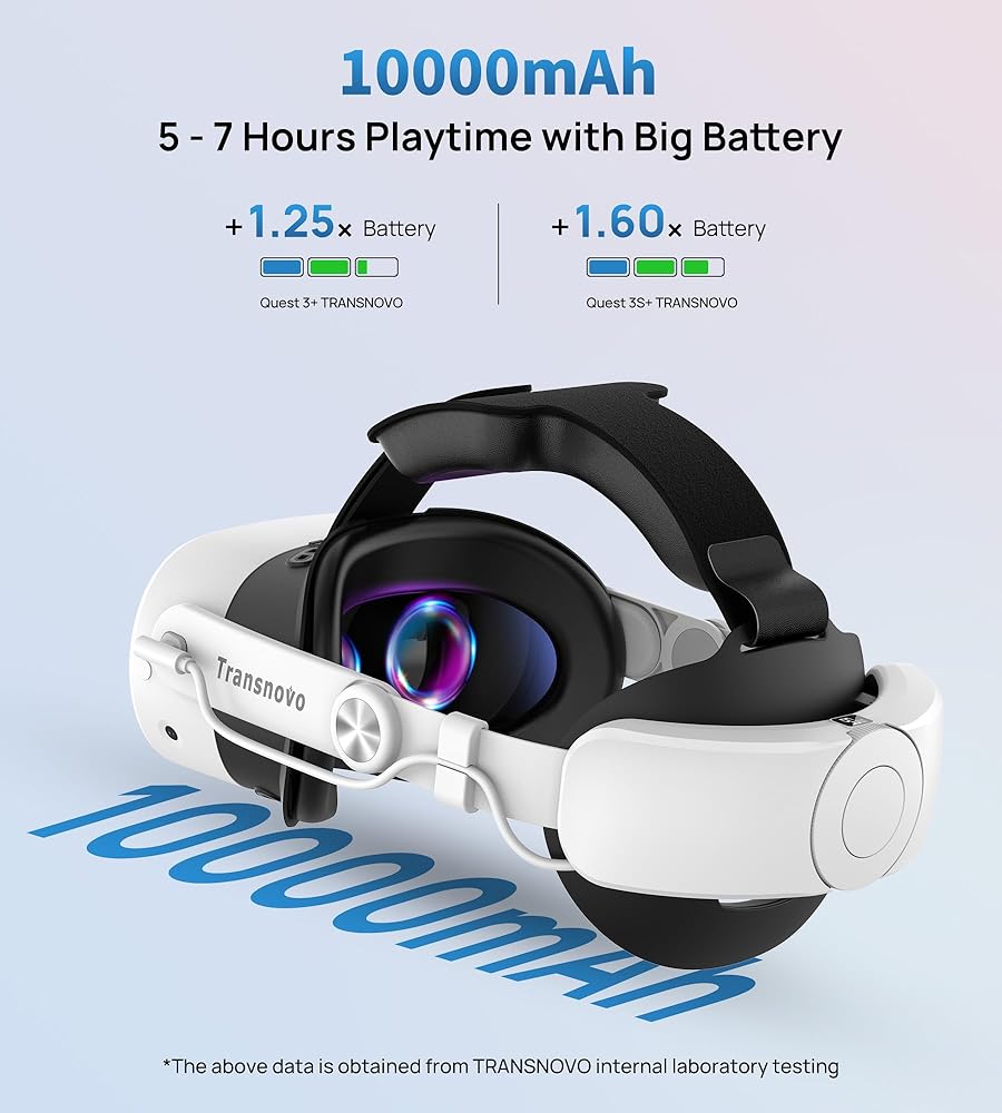حزمة رأس البطارية Transnovo 10000 مللي أمبير في الساعة مع غطاء تحكم السيليكون يتوافق مع Meta Quest 3S/ Quest 3 ، أحزمة مفصل نشطة قابلة للتعديل مع سهولة الوصول إلى البطارية واستبدالها