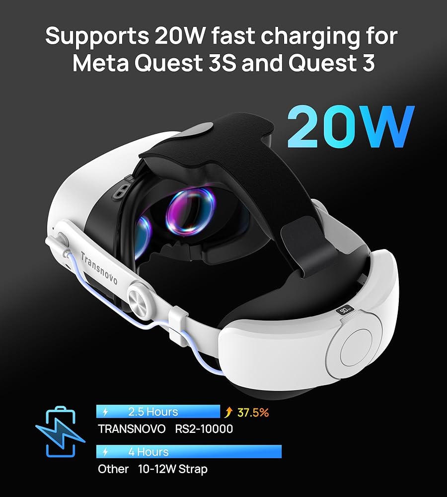 20W USB-C الشحن السريع: قوى سماعة Meta Quest 3 و Oculus Quest 3S VR في حوالي 2.5 ساعة ؛ يعيد شحن بطارية حزام رأس Transnovo مع محول 18W في حوالي 2.5 ساعة ؛ ملاحظة: لا يتم دعم الشحن عبر النجاح ولم يتم تضمين محول 18W