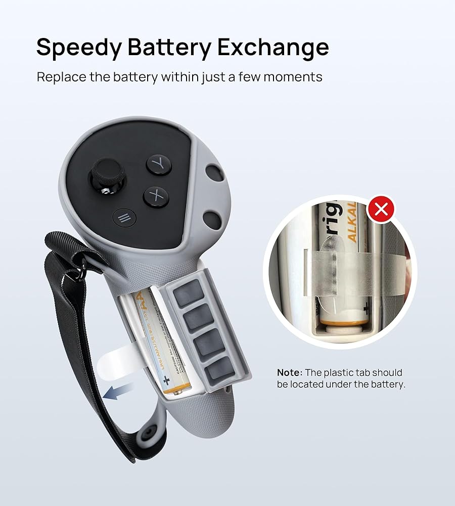 وصول مريح للبطارية: يتضمن مقصورة بطارية مفتوحة لاستبدال البطارية السريعة والسهلة دون الحاجة إلى إزالة قبضة السيليكون ، مما يضمن تشغيل Meta Quest 3 وحدات التحكم