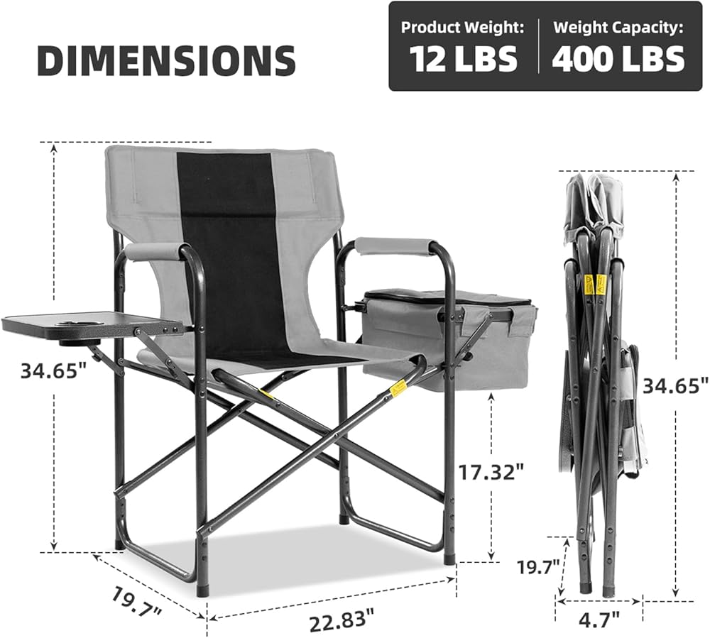 【Industrial-Grade Durability】400 lbs capacity director-style folding chair features storage pockets, a reinforced powder-coated steel frame, and durable 600D oxford fabric. Triple-stitched stress points and anti-rust joints ensure years of rugged outdoor use, from beach trips to tailgate parties