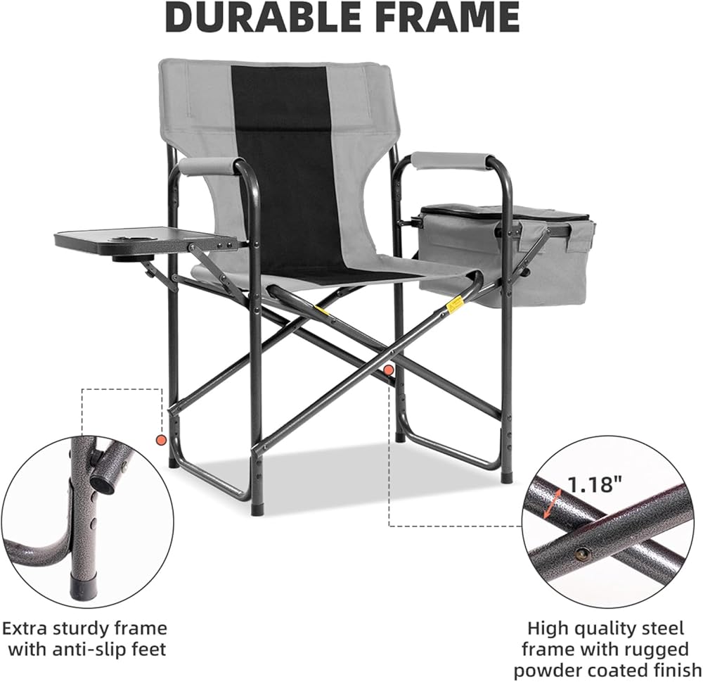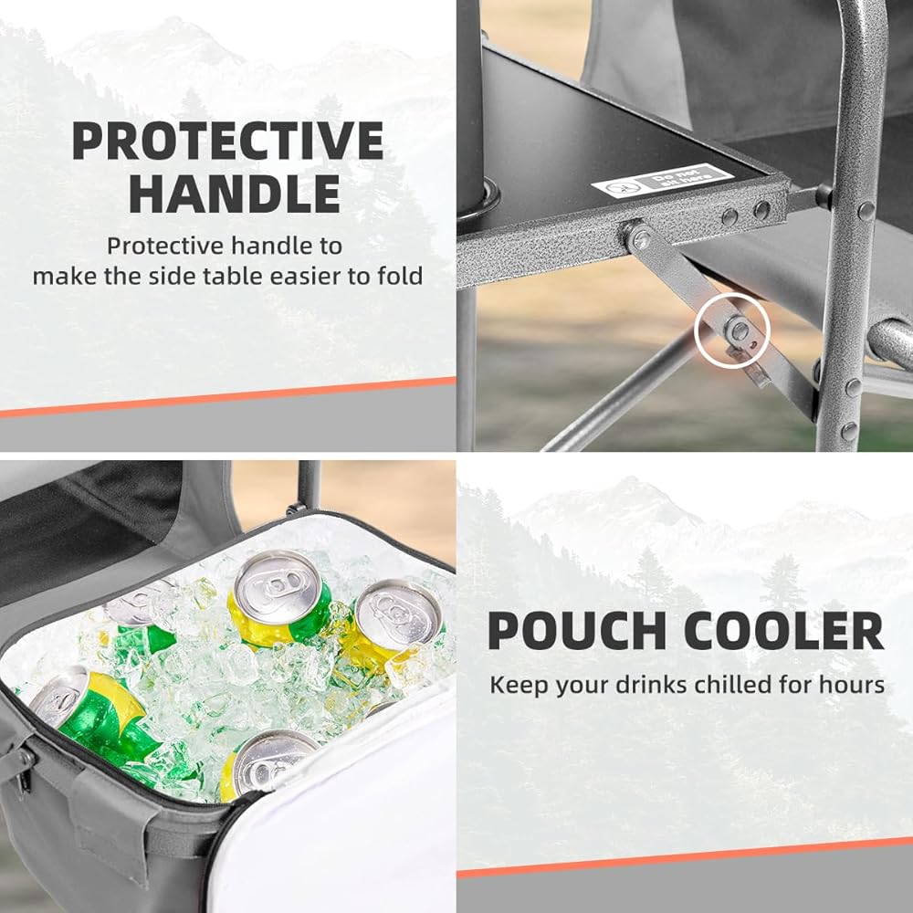 【All-in-One Outdoor Companion】Outdoor director's chair with side table, featuring an Integrated 4-can cooler bag & flip-down side tray with dual cup holders keeps drinks chilled and essentials organized. The padded armrests with phone slot and oversized storage pocket ensure ultimate convenience for camping/fishing/backyard events