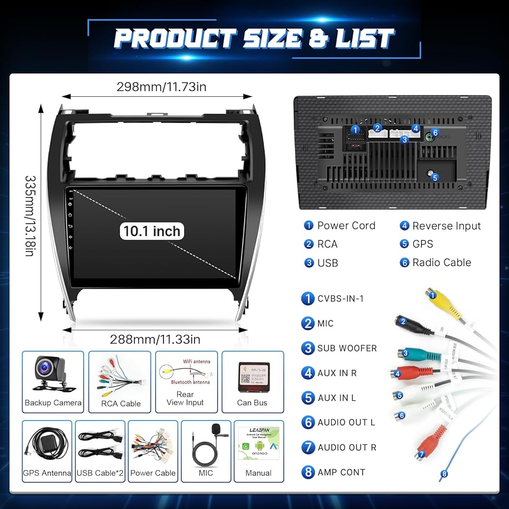 • 🚘【Android Car Radio for Toyota Camry Radio】This Leadfan android car stereo is perfectly suitable for toyota camry 2012 2013 2014, and no need to purchase additional accessories. Android 11 OS, 4-Core processor, 2G RAM+32G ROM,10.1 inch 2.5D IPS touch screen, wireless carplay android auto, wired/wireless mirrorlink, offline/online GPS navigation, WiFi connection,Bluetooth 5.1,FM radio,AHD backup camera,SWC,split screen, 2 USB, EQ adjustable, external microphone, multiple UI and wallpaper choose.