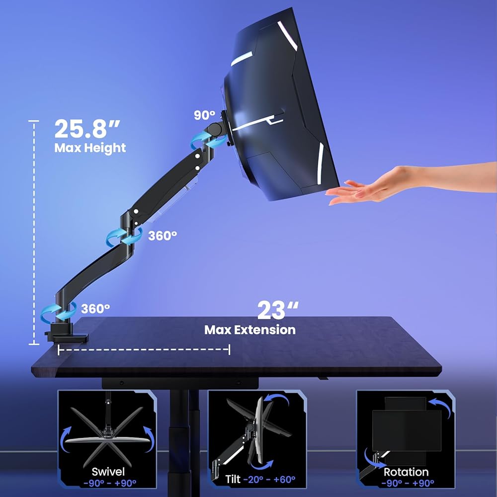 Fully Adjust and Space Optimization: It can swivel -90° - +90°, tilt -20° - +60°, and offers -90° - +90° rotation for optimal viewing which is suitable for people of different heights and ages; By swapping out your old bulky stand for this mount, you'll get valuable space, allowing for a neater, more organized environment, expanding your gaming or working area