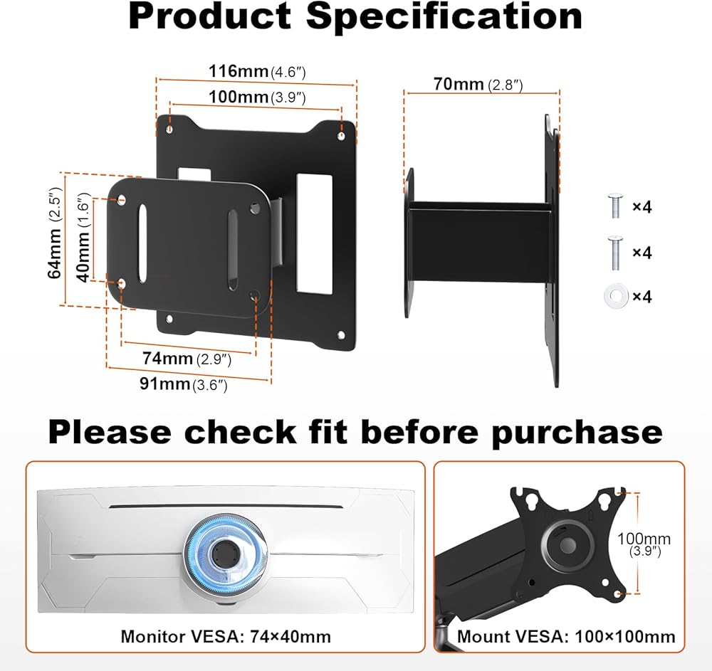 Please confirm your monitor model before purchasing. This adapter is only compatible with the following Samsung models: Samsung Odyssey G9, Neo G9, CRG9, CHG9, and CHG90. The monitor's VESA pattern is 2.91x15.7 inch(74x40mm), while the adapter supports a 100x100mm VESA standard. (Make sure to verify your monitor's compatibility before ordering!).