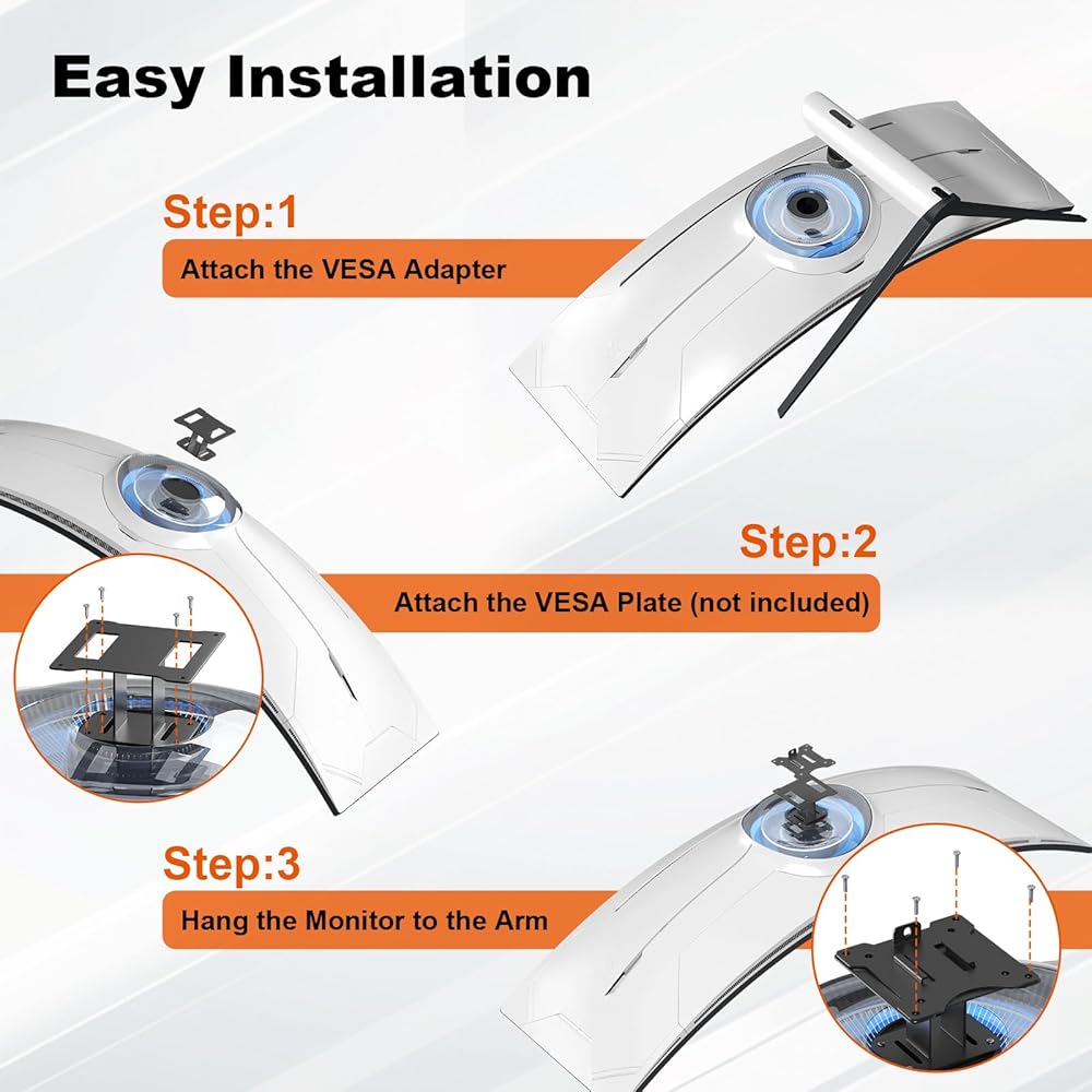 Warm Tips: Please check if your monitor has 75 x 75 mm or 100 x 100 mm VESA holes before purchasing; Because some ultrawide monitors such as 49'', 55'', 57'' monitors, they need to install a steel part ( it doesn't come with monitor arm package) to get 75 x 75mm or 100 x 100 VESA holes; Thus you can install with monitor arm successfully
