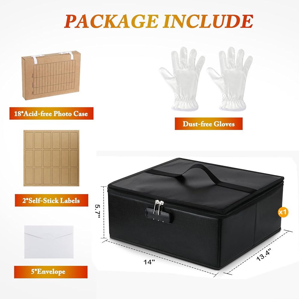 Shipping List: 1 x Fireproof Photo Storage Box 18pcs Acid-free Photo Case2pcs Self-Stick Labels 5pcs Envelope 1pcs Dust-free Gloves
