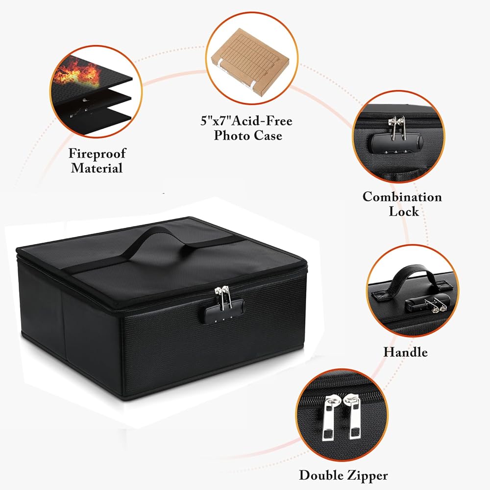 This photo organizer is made of double layered non-itchy silicone coated fiberglass which stands up the temperature up to 2000℉, protecting photo stored in the photo box from burning, and has excellent waterproofing properties to prevent damage from rain or water. It is ideal for storing and