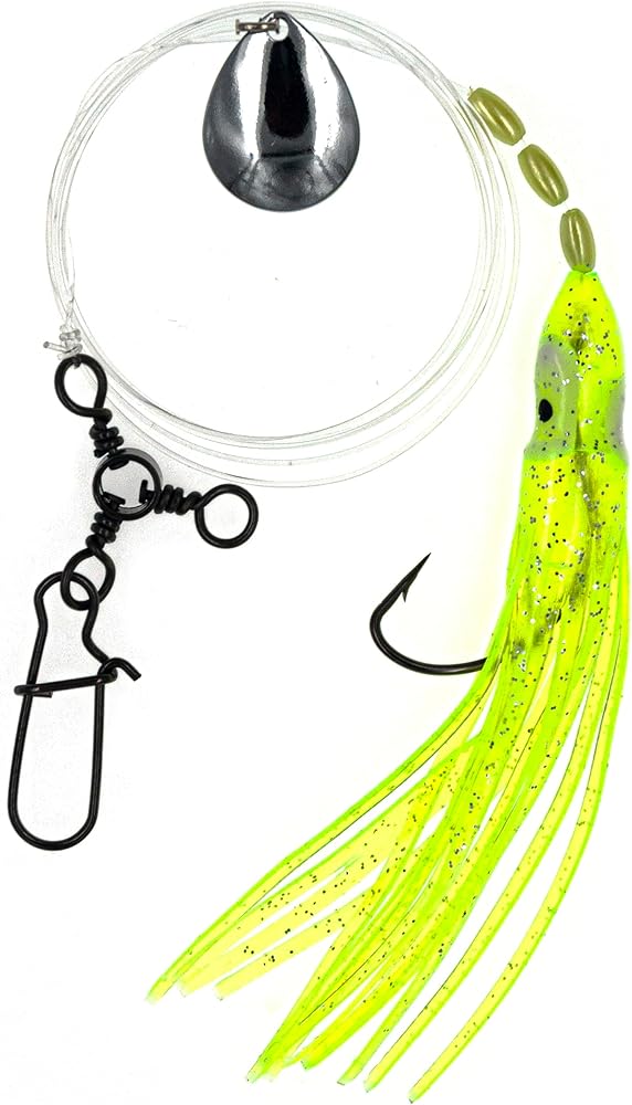 ATTRACTOR: The 0.71-inch spinners and High-visibility yellow-green skirts measuring 4 inches create enticing movement underwater to attract fish