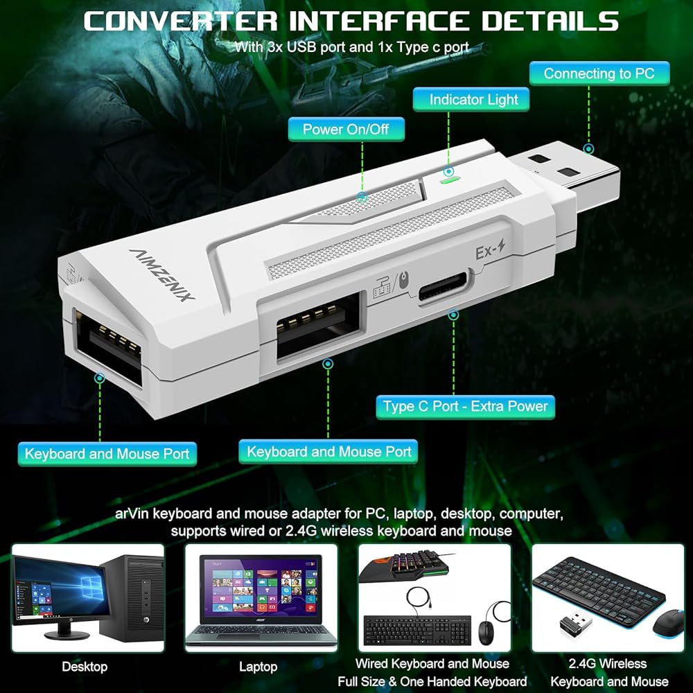 🖥 تم تصميم محولات لوحة المفاتيح ومحولات الماوس فقط للكمبيوتر الشخصي】 ARVIN لوحة مفاتيح ومحول الماوس للكمبيوتر الشخصي ، مما يوفر لاعبي الكمبيوتر الشخصي تحكمًا دقيقًا وتجربة ألعاب محسّنة. تدعم لوحة المفاتيح والماوس ADAPTE للكمبيوتر الشخصي ، الكمبيوتر المحمول ، سطح المكتب ، الكمبيوتر ، لوحة المفاتيح والماوس اللاسلكية السلكية أو 2.4G. [❌ ليس للمسرحيات ، Xbox ، التبديل ، الهاتف المحمول ، الكمبيوتر اللوحي ولوحة مفاتيح البلوتوث والماوس]