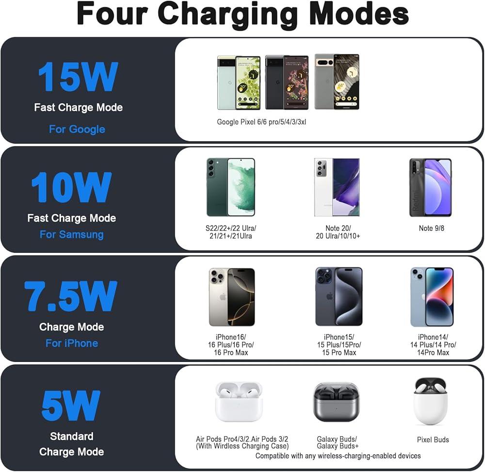 【التوافق الواسع】 وضع الشحن السريع 15W لـ Google Pixel 7/7 Pro/Pixel 6/6 Pro/Pixel 5 ؛ 10W شحن سريع متوافق مع S23/S22/S21/S20/S20+/Note 20/10/10/10+/S10/S10E/S10E/ملاحظة 9 وأكثر ؛ 7.5W الشحن السريع متوافق مع iPhone16/15/14/13/11/11/PRO MAX/X/XS/XS MAX/XR/8/8+؛ وضع الشحن القياسي 5W للهواتف الأخرى التي تدعم اللاسلكي والقرون الجوية. (هناك حاجة إلى محول QC3.0 أو PD لشحن سريع.)