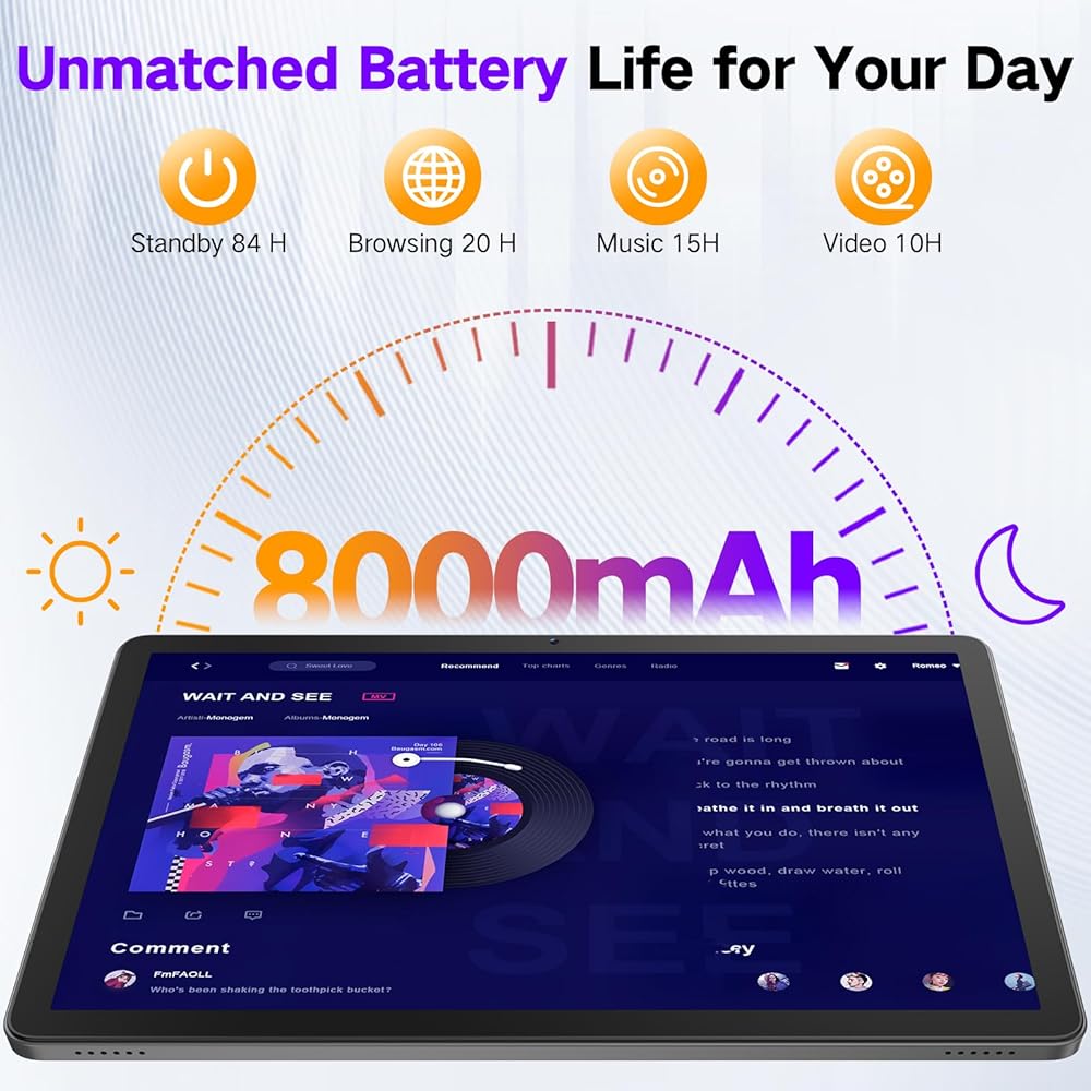【عمر بطارية بطول 8000 مللي أمبير في الساعة - تم تصميمه لمواكبةك طوال اليوم دون القلق بشأن الشحن. توفر بطارية 8000 مللي أمبير في الساعة ما يصل إلى 10 ساعات من الاستخدام - مثالي للأفلام أو مكالمات التكبير أو القراءة. أنحف وأخف وزنا من معظم الأجهزة اللوحية 11 بوصة ، فإنه يناسب بسهولة مع حقائب الظهر أو المحافظ. تم تصميمه مع مراعاة المتانة ، إنه أمر رائع للاستخدام في المنزل والمنزل. فكرة هدية مدروسة مع عبوة أنيقة وإكسسوارات شاملة (شاحن ، كابل USB-C ، يدوي).