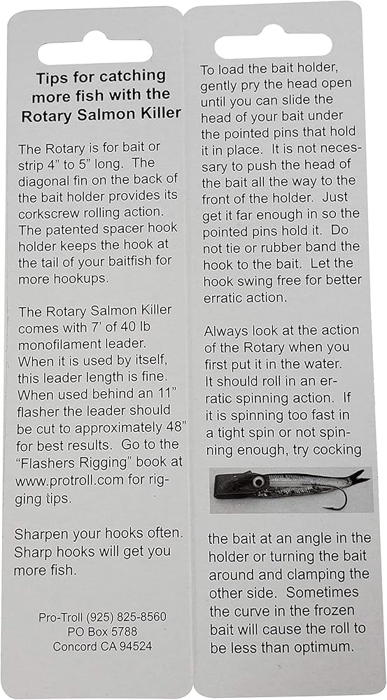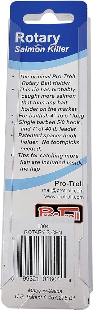 Big Fin E-Rotary Salmon Killer Similar in design to the E-Rotary Salmon Killer except the Big Fin is designed for baitfish 6 to 7 Inch long. It has a larger diagonal fin needed to rotate the larger baitfish and the hook is spaced further to the rear to place it at the tail of the baitfish. Available in 5 colors, it comes rigged with top grade stainless 5/0 hook, 7 foot 40 lb. leader and 75 lb. test bead chain swivel.