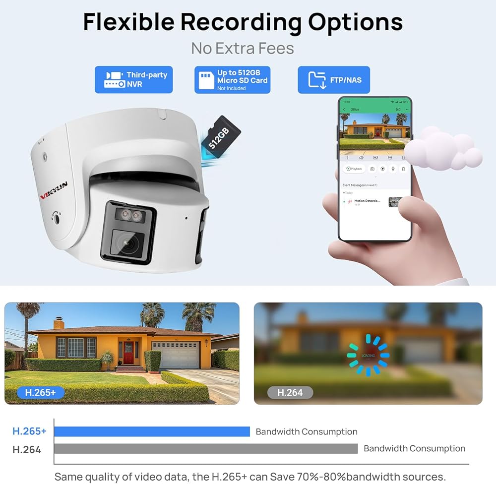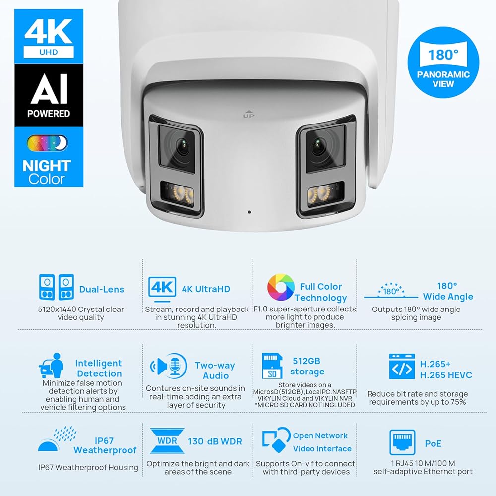 compression الضغط العالي والتوافق】 هذه الكاميرا الأمان المزدوجة 4K 8MP تعتمد كاميرا أمان IP على مستوى الترميز العالي. لا تنقل مقاطع فيديو أكثر وضوحًا وأكثر سلاسة ، ولكنها توفر أيضًا 75 ٪ من مساحة تخزين القرص. تعمل كاميرا Poe البانورامية التي تبلغ 8 ميجابكسل هذه مع Poe NVR ، ويدعم بروتوكول واجهة الفيديو المفتوحة للشبكة للتواصل مع Poe NVR من طرف ثالث ، ومتوافق مع معظم برامج مراقبة الأمان ، مثل Blue Iris و ISPY و VLC ، إلخ. فتحة بطاقة الذاكرة المدمجة تدعم ما يصل إلى 512 جيجابايت.