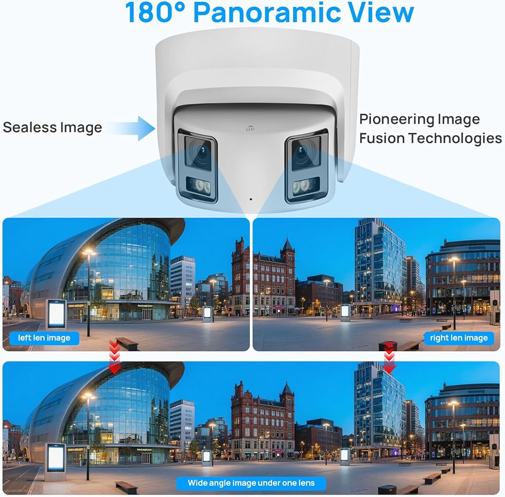 【4K Ultra HD 180 ° كاميرا بانورامية】 تم تجهيز هذه الكاميرا الأمان المزدوجة ذات 8 ميجابكسل مع CMOs المدمجة 2 × 1/2.7 بوصة ، و 2 × 2.8 مم عدسة ثابتة ، وفتحة F1.6 التي توفر منظرًا واسعًا جدًا. حتى تتمكن من رؤية 180 درجة عرضة للفرش. مناسبة للتركيب أو تصحيح الأخطاء في المناطق الخارجية الكبيرة ، والمسافة لا تقل عن 4 أمتار ، بحيث تكون صورة المراقبة واضحة.