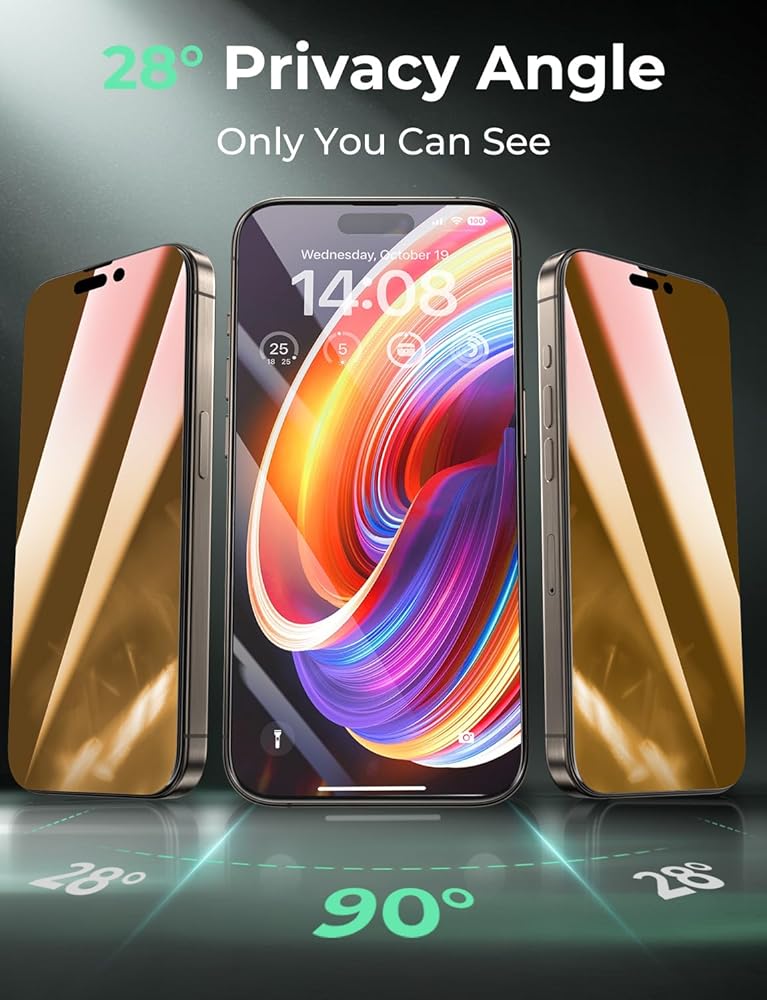 تحول الألوان وحماية الخصوصية 28 °: يضم حامي شاشة خصوصية AK John iPhone 16 28 درجة من التقنية المضادة للبوب ، وتبقي شاشتك مرئية فقط بزوايا مباشرة .. عندما يتم عرضها من الجانبين ، فإنها تعرض تأثيرًا ملونًا لقوس قزح-حماية خصوصيتك أثناء إضافة لمسة أنيقة