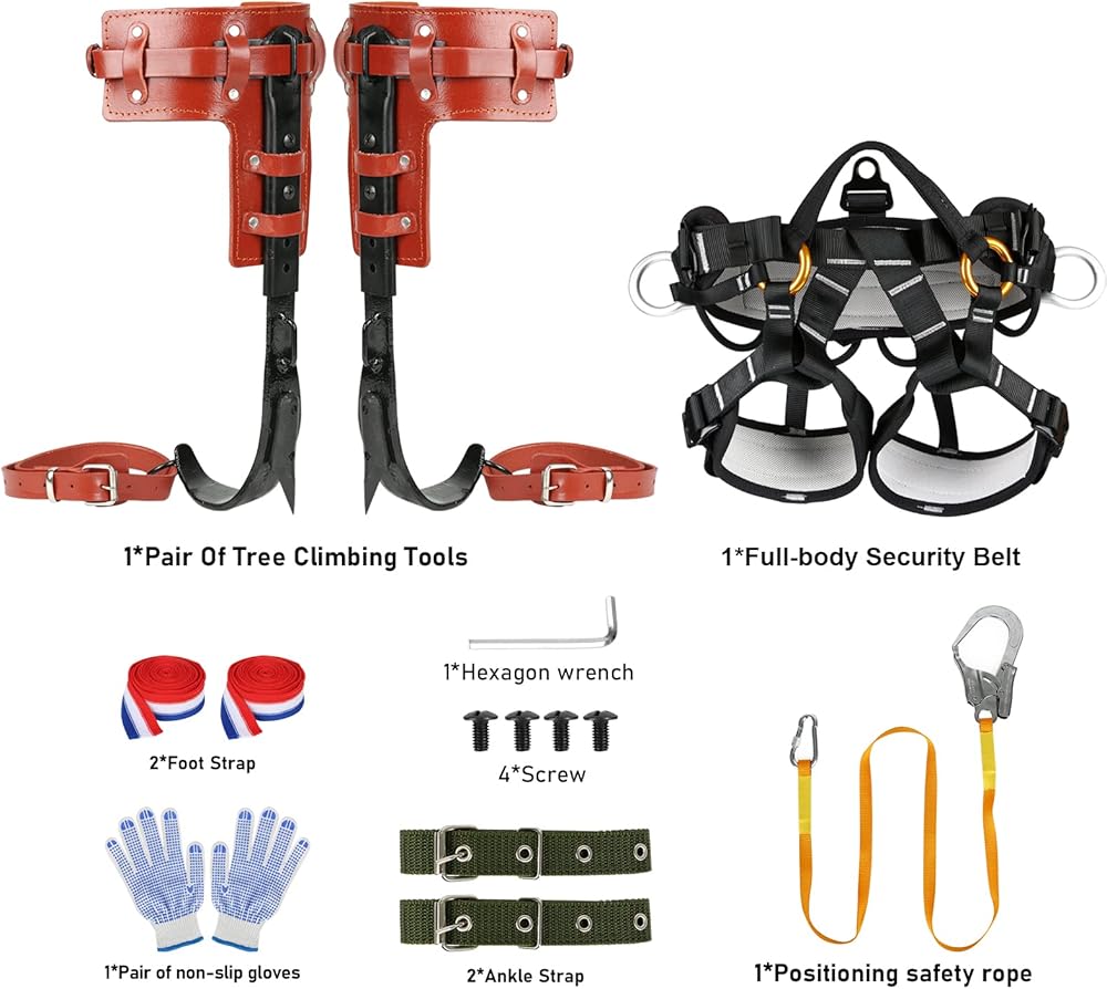 مجموعة كاملة - 1* زوج من أدوات تسلق الأشجار ، 2* أحزمة القدم ، 2* أحزمة الكاحل ، 2* قفازات ، أحزمة حزام 1* 70 بوصة ، 1* أحزمة مقعد التسلق. تعتبر أداة تسلق الأشجار هذه مثالية لتسلق الأشجار ، وبقاء الأدغال ، واختيار الفاكهة ، والعمل في الارتفاع وأكثر من ذلك بكثير.