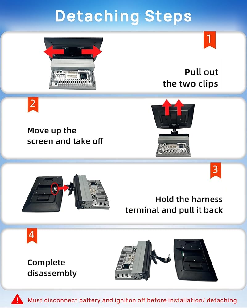 تحذير مهم: قبل البدء في التثبيت ، قم بتثبيت الراديو أو الأسلاك أو الأسلاك أو إزالة شاشة اللمس ، قم دائمًا بفصل الطرف السلبي للبطارية وإيقاف الإشعال. سيساعد هذا على منع التلف الكهربائي لشاشة لمس ستيريو 10 بوصة