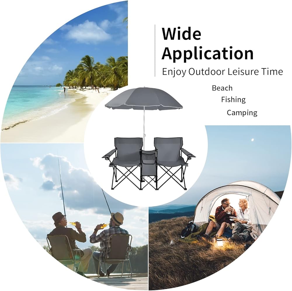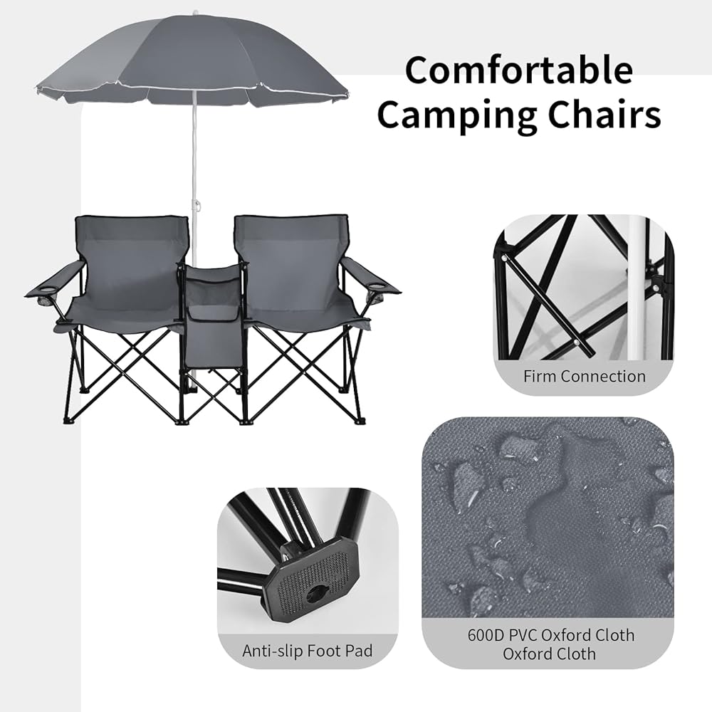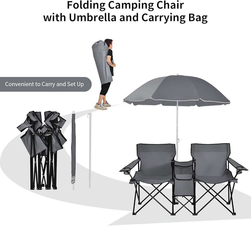 كراسي شاطئية قابلة للطي مزدوجة مع مظلة ، كراسي محفوظة للنزهة في الهواء الطلق مع مظلة قابلة للإزالة وطاولة صغيرة تحمل كيسًا ، كرسي التخييم للفناء ، بركة ، بارك (رمادي)
