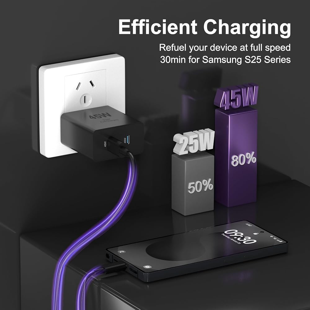 samsung Charger Charger Fast Charger】 شاحن Samsung الشاحن السريع مع أقصى قدر من طاقة 45 واط Samsung Super Fast Charge تستخدم تقنية توصيل الطاقة لتوفير قوة الشحن الأكثر كفاءة. شحن سريع للغاية لشركة Samsung Galaxy S25 S24 Ultra/S24/S23 ULTRA من 0 ٪ إلى 50 ٪ في 20 دقيقة فقط ، أعلى بكثير من شاحن 15W أو 25W.
