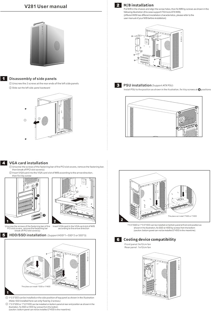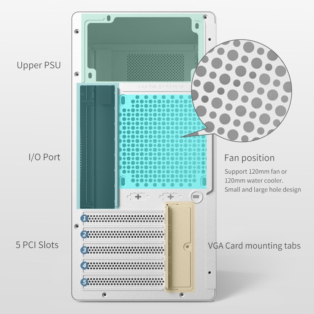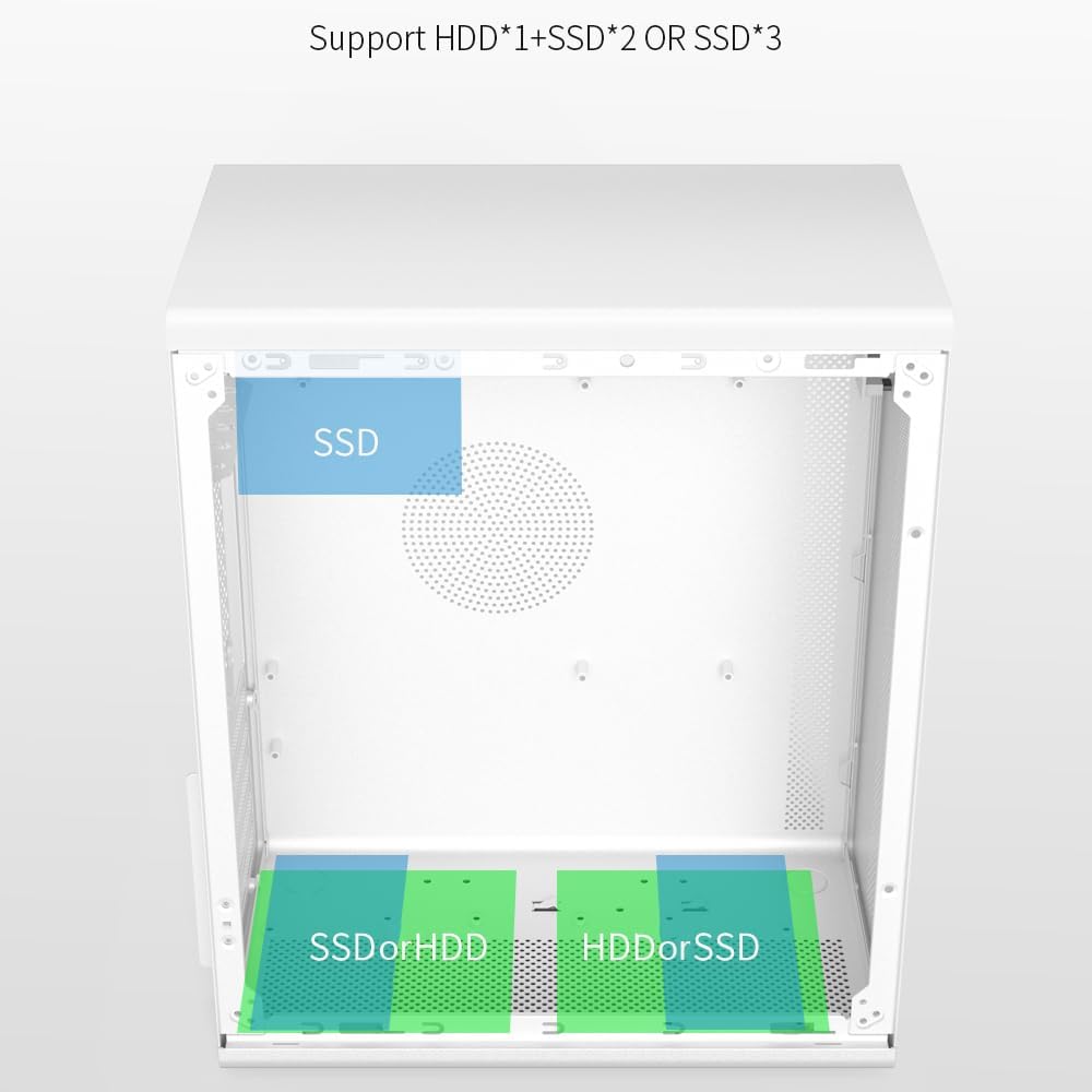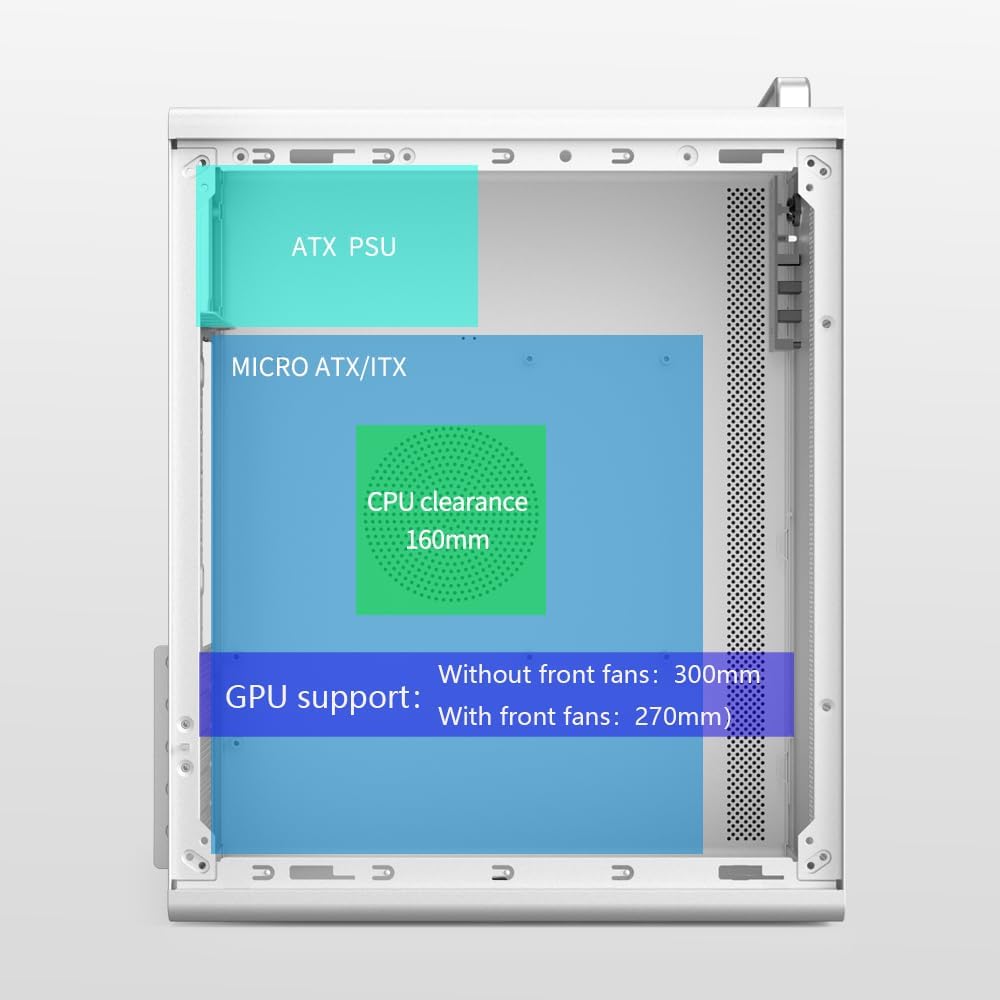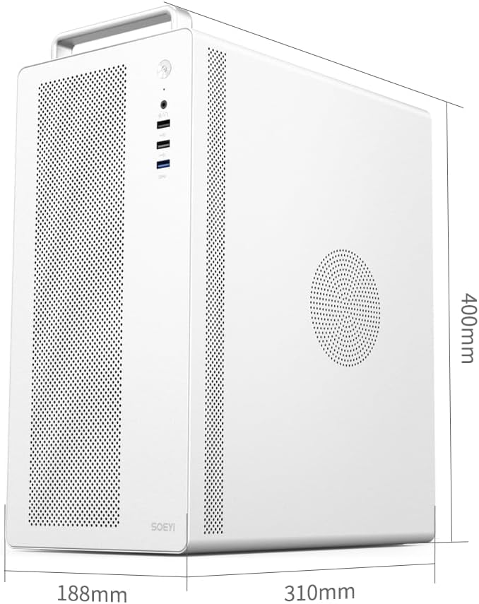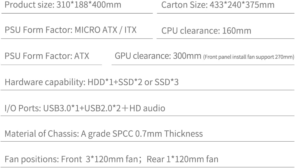 • PSU Form Factor:MICRO ATX/ITX CPU cooler clearance:160mm GPU clearance:300mm (with front fans 270mm) PSU Form Factor:ATX Hardware capability:HDD*1+SSD*2orSSD*3 I/O Ports:USB3.0*1+USB2.0*2+HD audio Material : SPCC 0.7mm Thickness Fan positions:Front 3*120mm fan;Rear1*120mm fan.. Productsize:310*188*400mm Carton Size:433*240*375mm
