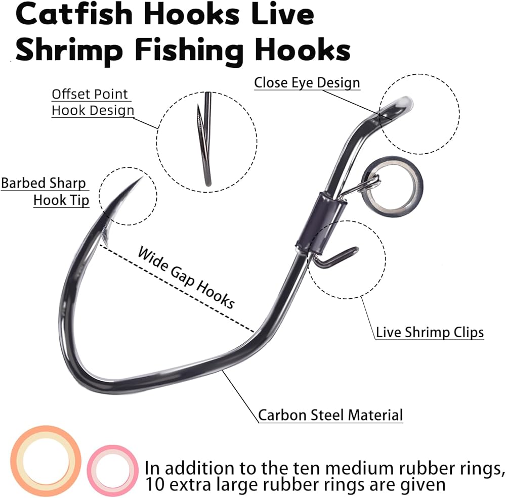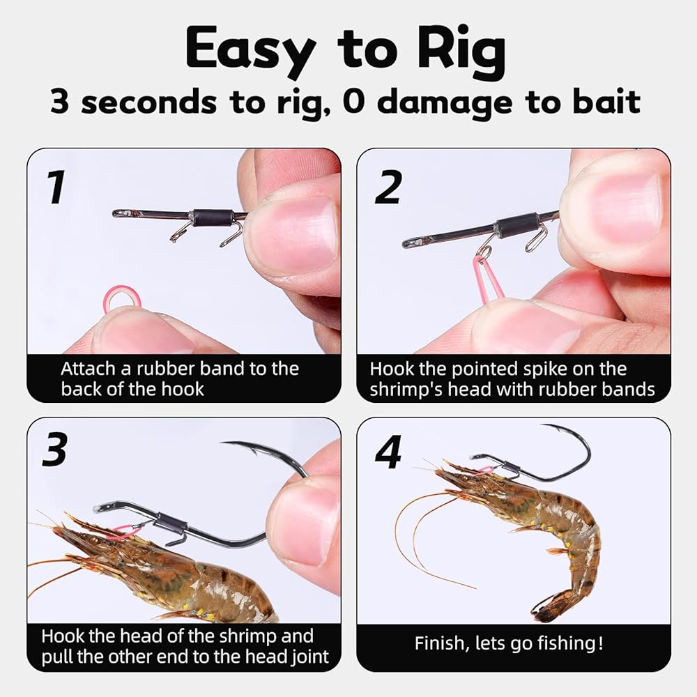 إعداد خطاف الروبيان الفوري: لا توجد خيوط عيون أو شجاعة! كليب الروبيان في 5 ثوان: شريحة من المطاط ، snap spring (يعمل مع الروبيان Walker Hook). يبقى الطعم حيويًا لخطافات الجهير وسنانير سمك السلور.
