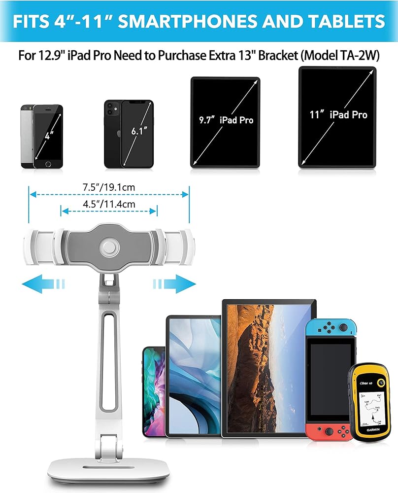• يتولى حامل iPad Universal Apple iPad مع المشابك على كلا الجانبين أي أجهزة الكمبيوتر اللوحي 4 "-11" (iPad Air/Mini/10.5 بوصة iPad Pro/Galaxy Tab) أو الهواتف الذكية (iPhone X 8 & 8 Plus 4/6/7/7/Plus/Samsung Galaxy) مع قياس العرض أو الطول بمجموعة من 4.5-7.5 "، وهو مثالي من مكتب IPAD.