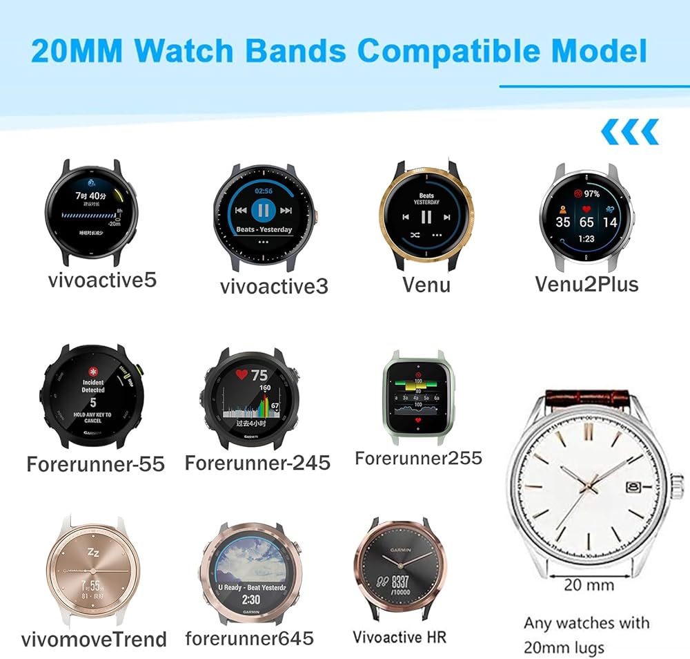 نماذج متوافقة: نطاقات Sugarjar متوافقة مع Garmin Vivoactive 5/Vivomove 3 40mm/Vivoactive 3/3 Music/HR ، حزام ساعة مضفر 20 مم لـ Garmin Venu Sq/Sq 2/Sq Music/Sq 2 Music ، و MosteS WAGH SHAYPENG 42MM. (يمكن العثور على المزيد من النماذج على صفحة التفاصيل.)