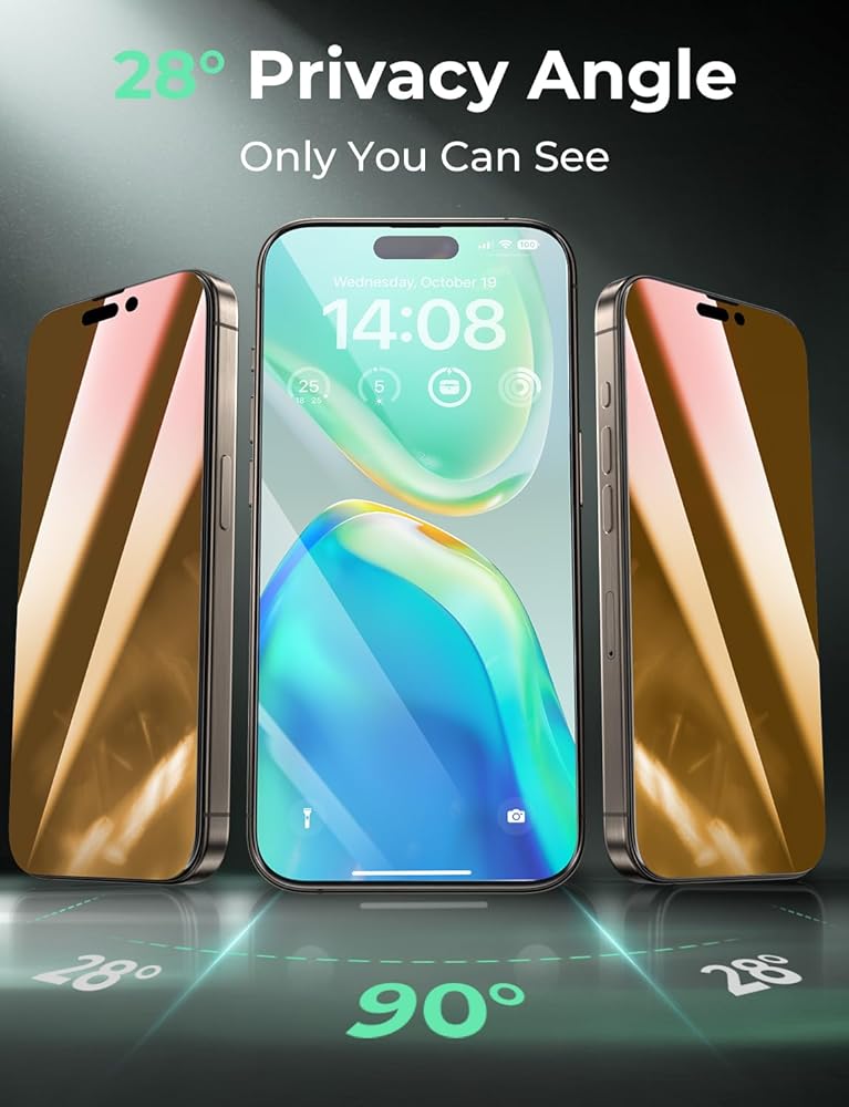 تحول الألوان وحماية الخصوصية 28 درجة: AK John iPhone 15 Pro Max Privacy Screen Protector يتميز بتكنولوجيا مكافحة 28 درجة يحافظ على شاشتك مرئية فقط بزوايا مباشرة .. عندما يتم عرض