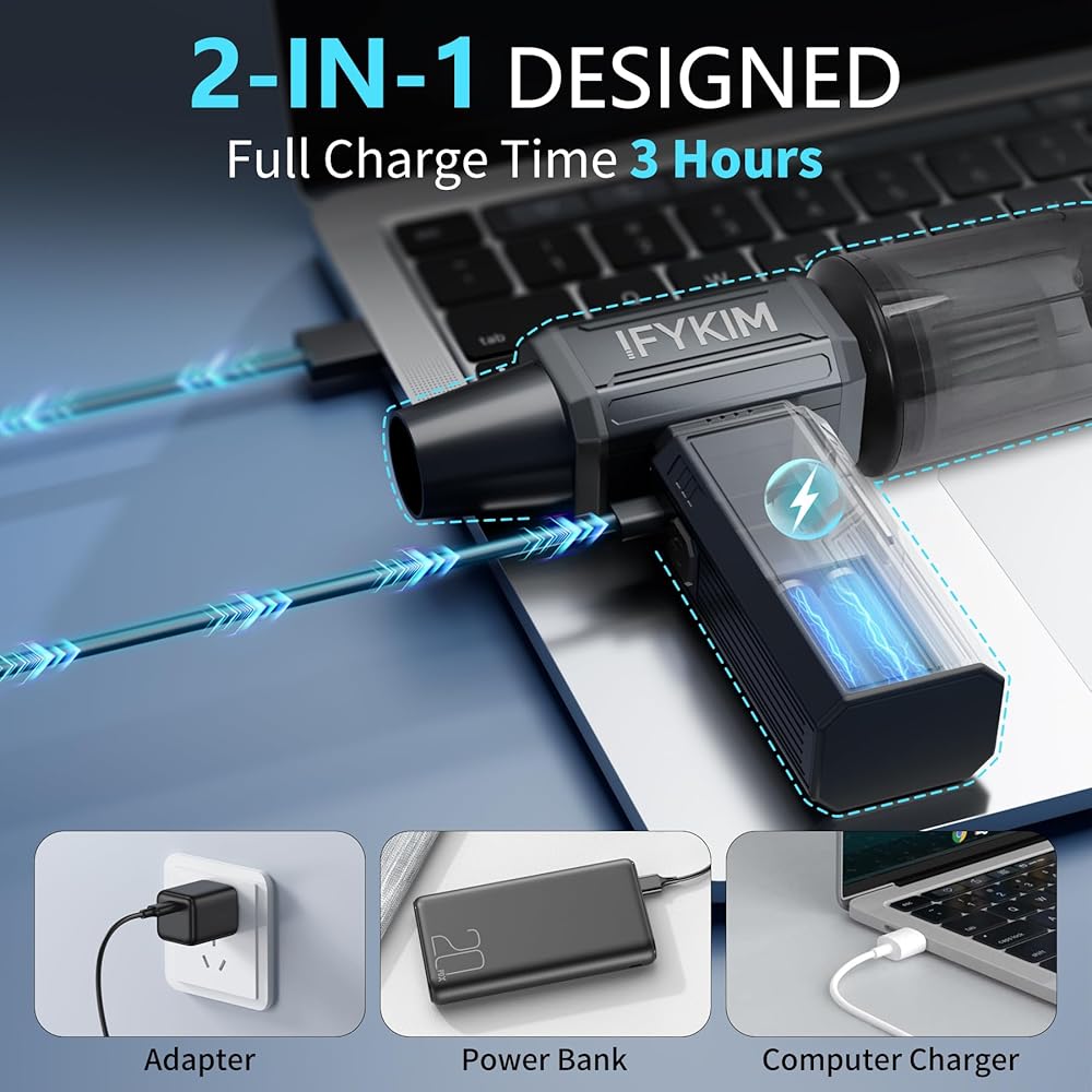 • البطارية القوية: الشحن السريع وعمر البطارية الطويل. يأتي Duster Air القابل لإعادة الشحن مع كابل شحن USB Type-C الذي يدعم ما يصل إلى 10W ، يمكن شحنه بالكامل في غضون 3.5 ساعات ويعمل الحد الأقصى لمدة ساعتين. إعادة الشحن وإعادة الاستخدام والأداء المستقر ودرجة الحرارة وحماية الدائرة القصيرة