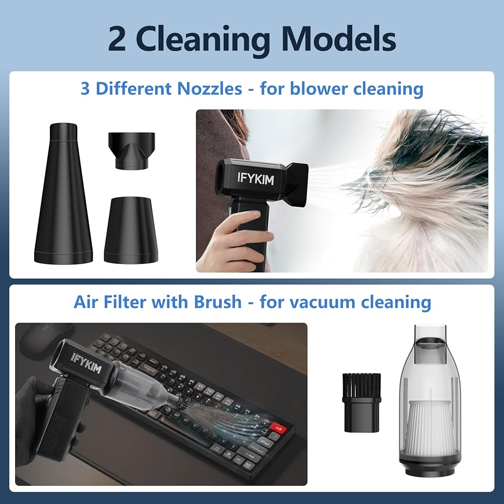 • تنقية الهواء المطورة: الجمع بين الشفط وإزالة الغبار ، يمكن أن ينفجر الغبار من جهاز الكمبيوتر الخاص بك بكفاءة أعلى ، وتنظيفه بشكل أكثر شمولية ويسهل عليك تنظيف سطح المكتب والكمبيوتر المحمول والكمبيوتر الشخصي والكمبيوتر. يوصى باستخدام نهاية النفخ لتفجير الغبار أولاً ، ثم استخدام نهاية الشفط لامتصاصها ، والتي تكون أكثر نظافة ويمكنها أيضًا تجنب التفكك المتعدد والتنظيف