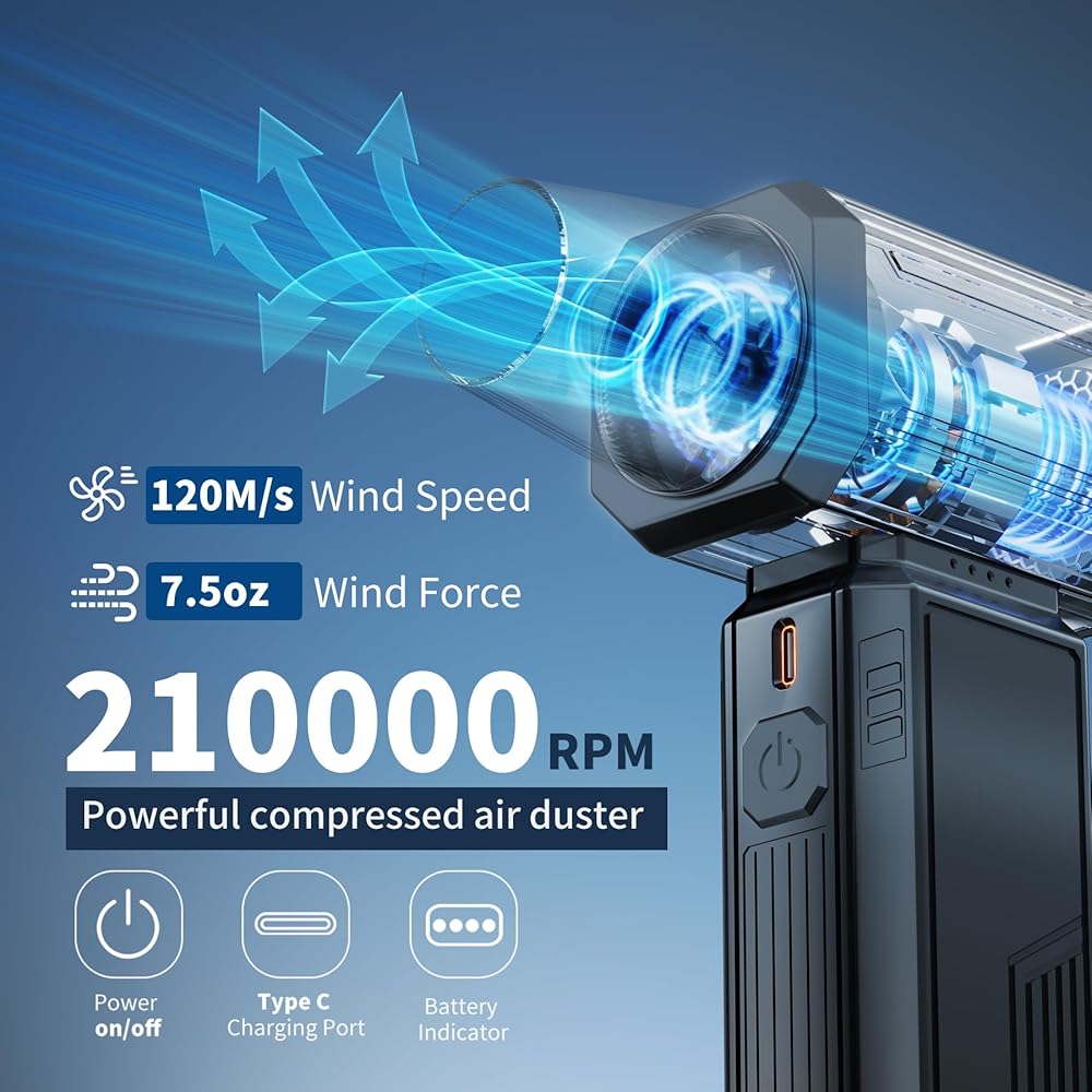 Duster Air Air مضغوط: 2-in-1 فراغ الهواء القابل لإعادة الشحن والمنفاخ ، 210000 دورة في الدقيقة محمولة مروحة طائرة توربو محمولة للكمبيوتر والسيارات والتنظيف المنزلي , السرعة بدون خطوة وعدم المعلبة واللوح اللاسلكية