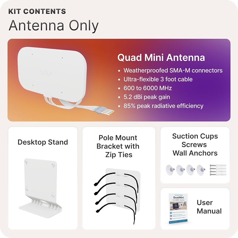 MULTIPLE MOUNTING OPTIONS: The QuadMini has a variety of mounting options, including strong suction cups for window attachment, a pole mount adapter, a desktop stand, and direct wall mounting. No matter where the signal is strongest, the QuadMini will fit!