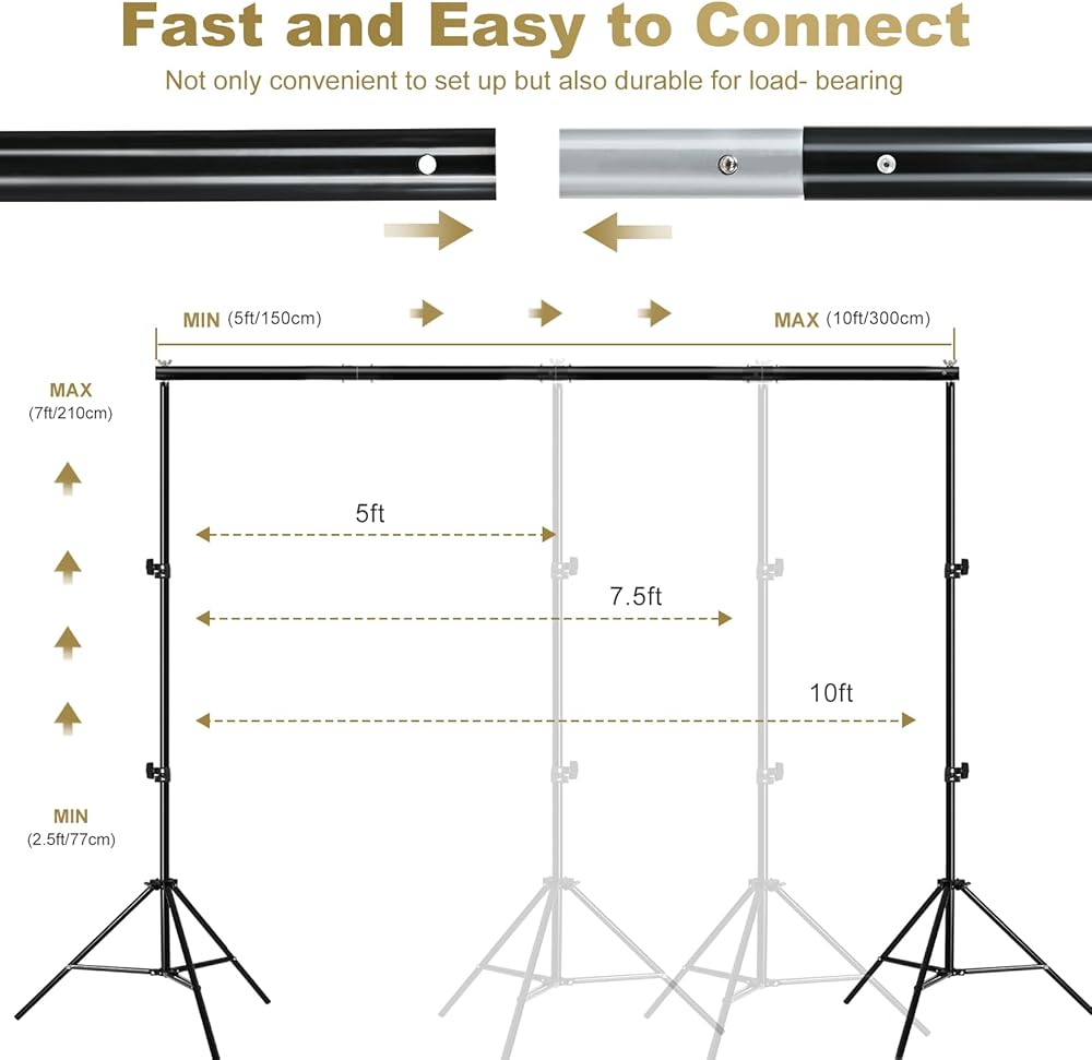 • 【10 × 7 أقدام قابلة للتعديل موقف الخلفية - إعداد مرن】 الارتفاع القابل للتعديل والطول زيادة المرونة لتلبية الاحتياجات المختلفة وفقا لمتطلبات التصوير ، وبالتالي زيادة التنوع. ارتفاع قابل للتعديل 77-210 سم ؛ طول قابل للتعديل 150-300 سم.