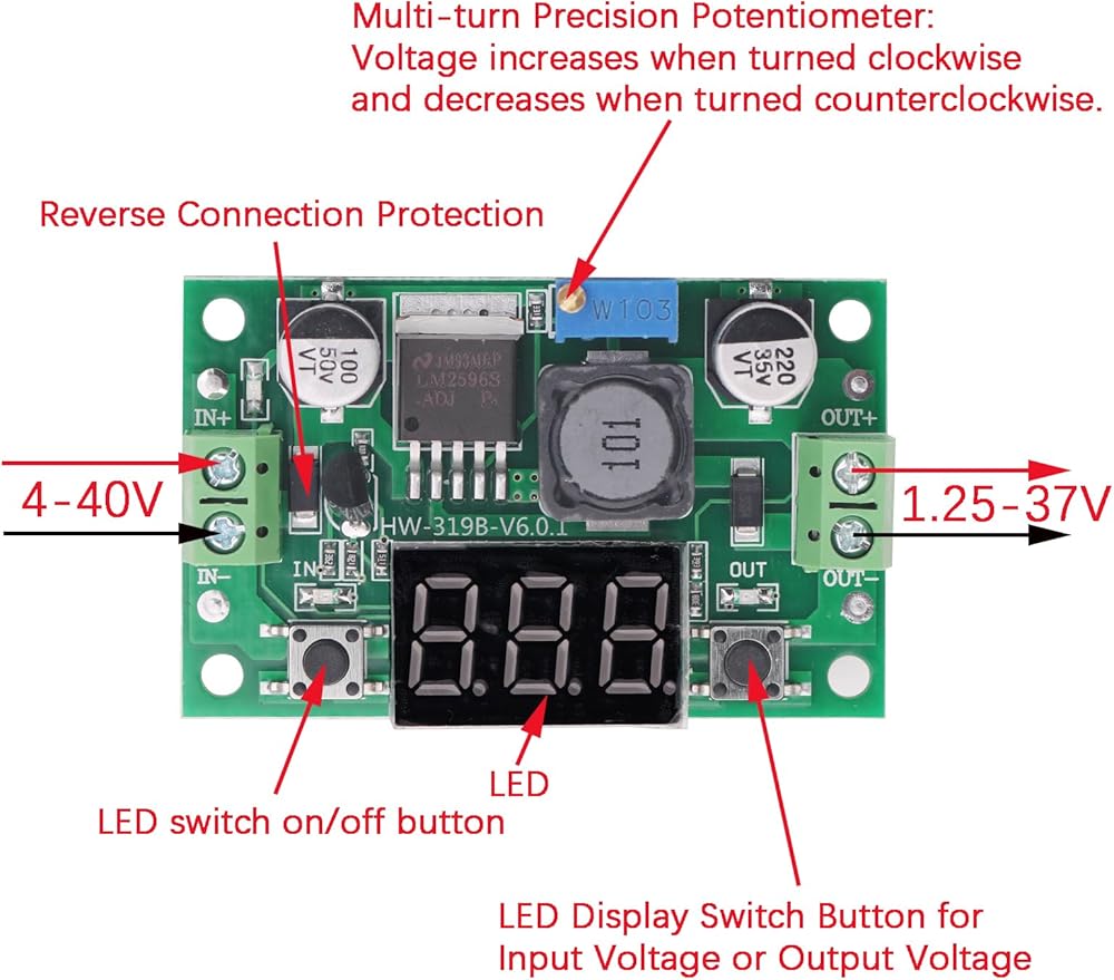Wide Voltage Range: Supports input voltages from 4.0V to 40V and adjustable output voltages from 1.25V to 37V. The LM2596 can be used in DIY mobile power, monitor power supply, power buggies, camera power supply, car power, communications equipment supply, 12V to 3.3V / 5V, 24V to 5V / 12V, various right size and weight for demanding applications.